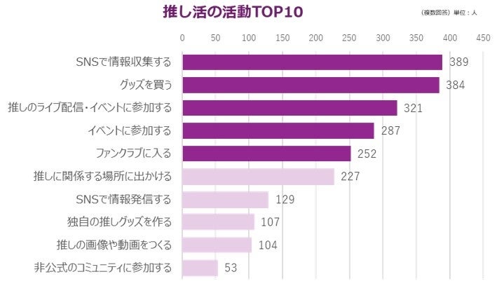 また、推し活をしていて良かったことについての質問では、「日々の活力になる」や「推しがいる事で生きていられる」などのモチベーションや励みを感じたり、「同じ趣味の人と出会えて、友達が増えた」「楽しい!若返る!生きがい!」といった、新たな出会いや人生の充実を喜ぶ声が多数聞かれ、いまや、推し活は日常生活を豊かにする人々のライフワークとなっているようです。