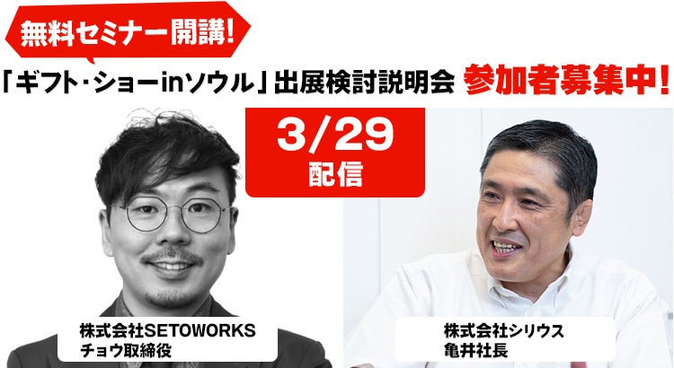 韓国をはじめアジア各国への日本企業進出の支援・コンサルティングを手掛ける、株式会社SETOWORKSのチョウボンジン取締役と、同社のサポートを受け、実際に韓国進出を成功させた株式会社シリウスの亀井隆平社長が登壇。韓国進出の秘訣をお話しします。