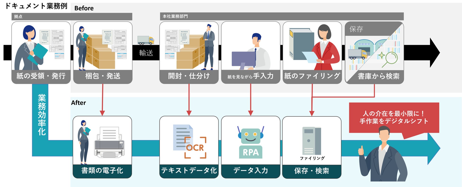 近年、DXの広がりに伴い、「ペーパーレス化による時間や場所にとらわれない柔軟な働き方」や、「AIやロボットを活用した業務の自動化」の実現に向け、業務のデジタル化が課題となっています。企業内のペーパーレス化は進みつつありますが、企業外との情報伝達、共有においては、現在も紙文書でのやりとりが多く発生し業務プロセス効率化の障壁となっています。