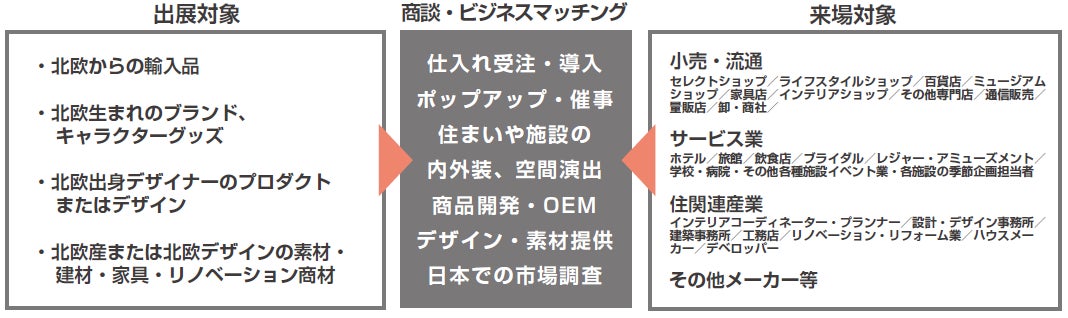 会場では主にセレクトショップ、インテリアショップ、商業施設、ホテル・旅館、サウナ、温浴・グランピング施設、デザイン・設計事務所、百貨店、ミュージアムショップ、ギャラリーなど、さまざまな業界や業種に対し北欧雑貨を幅広く提案することが可能です。