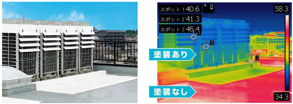 右:遮熱塗料を塗装している部分だけが温度が低い。