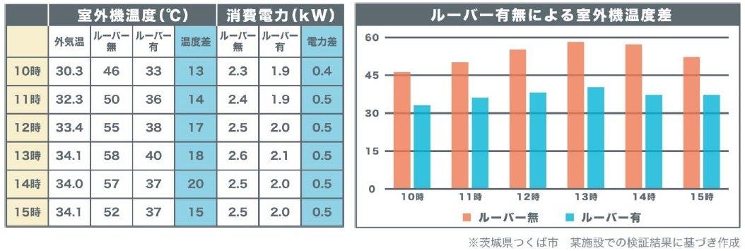 専用ルーバーには遮熱塗料が塗装されているため、夏場はひさし代わりとなり、室外機の温度上昇抑制につながり、年間を通してCO2排出量・電気代削減に効果を発揮します。