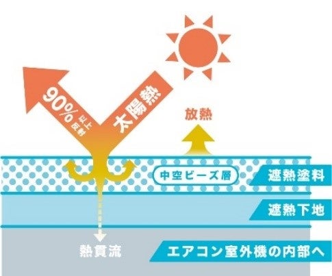 使用する遮熱塗料は、太陽熱の反射率を約90%以上キープしながら、塗料内の中空ビーズによる断熱層を形成することで、遮熱性と断熱性を両立します。夏場の室外機の温度上昇をしっかり抑えることができ、年間約10~20%のCO2排出量・電気代※1を削減できます。