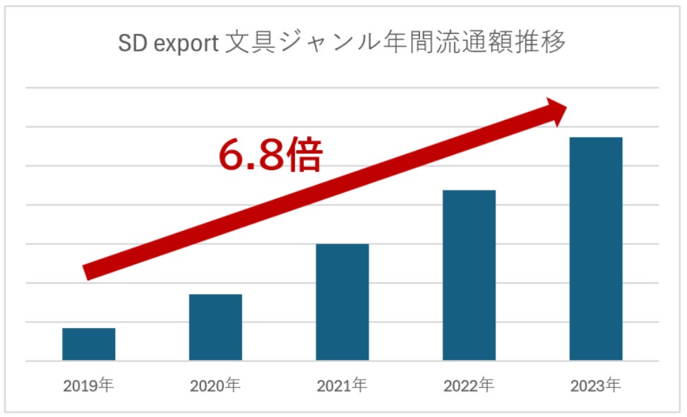 ラクーンコマースが提供する「スーパーデリバリー」の越境版「SD export」の文具ジャンルの流通額は、新型感染症拡大前と比較して4年間で約6.8倍になりました。(2019年1月~12月と2023年1月~12月の比較)