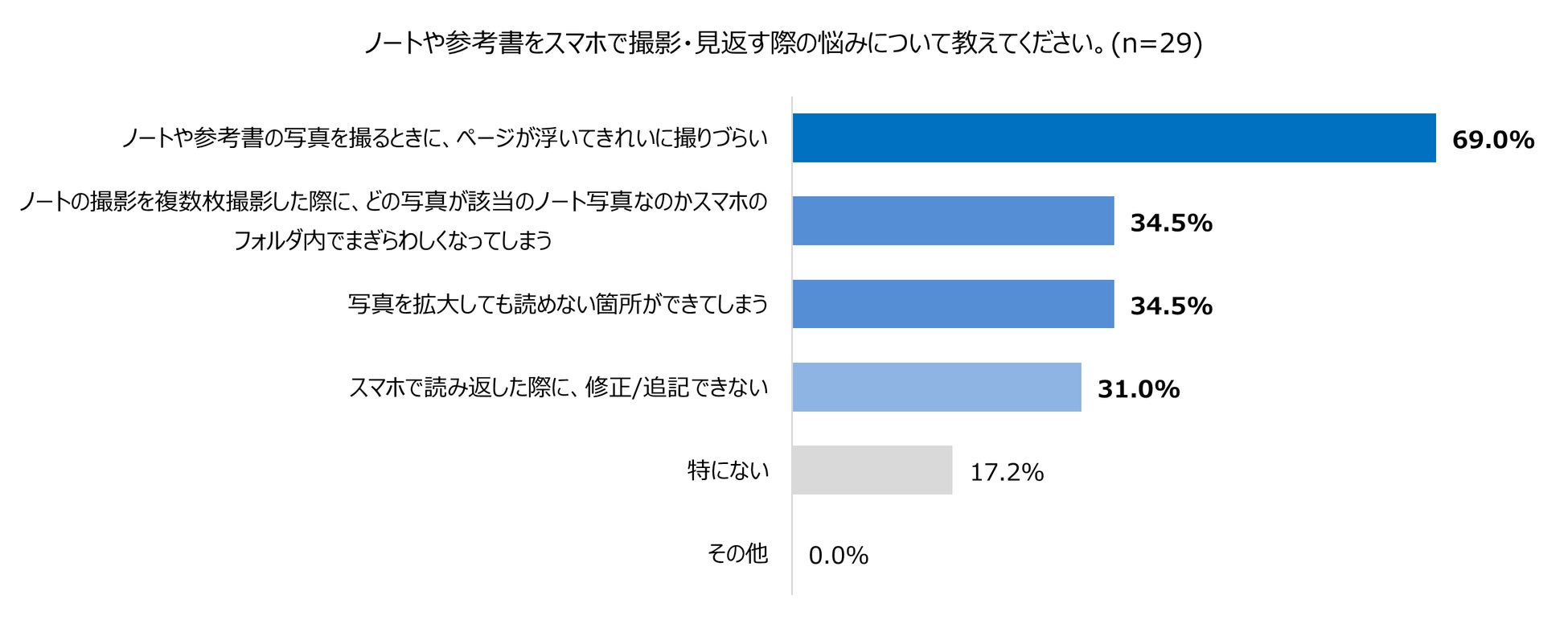 「ノートや参考書の写真を撮るときに、ページが浮いてきれいに撮りづらい(69.0 %)」や