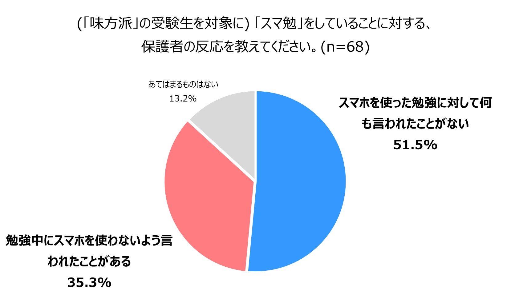 「味方派」の現役大学受験生からみた、スマ勉を行う我が子に対する保護者の反応は、約半数の親が何も言わず認めている一方で、3割超(35.3%)の現役大学受験生が保護者から「勉強中にスマホを使わないよう言われた