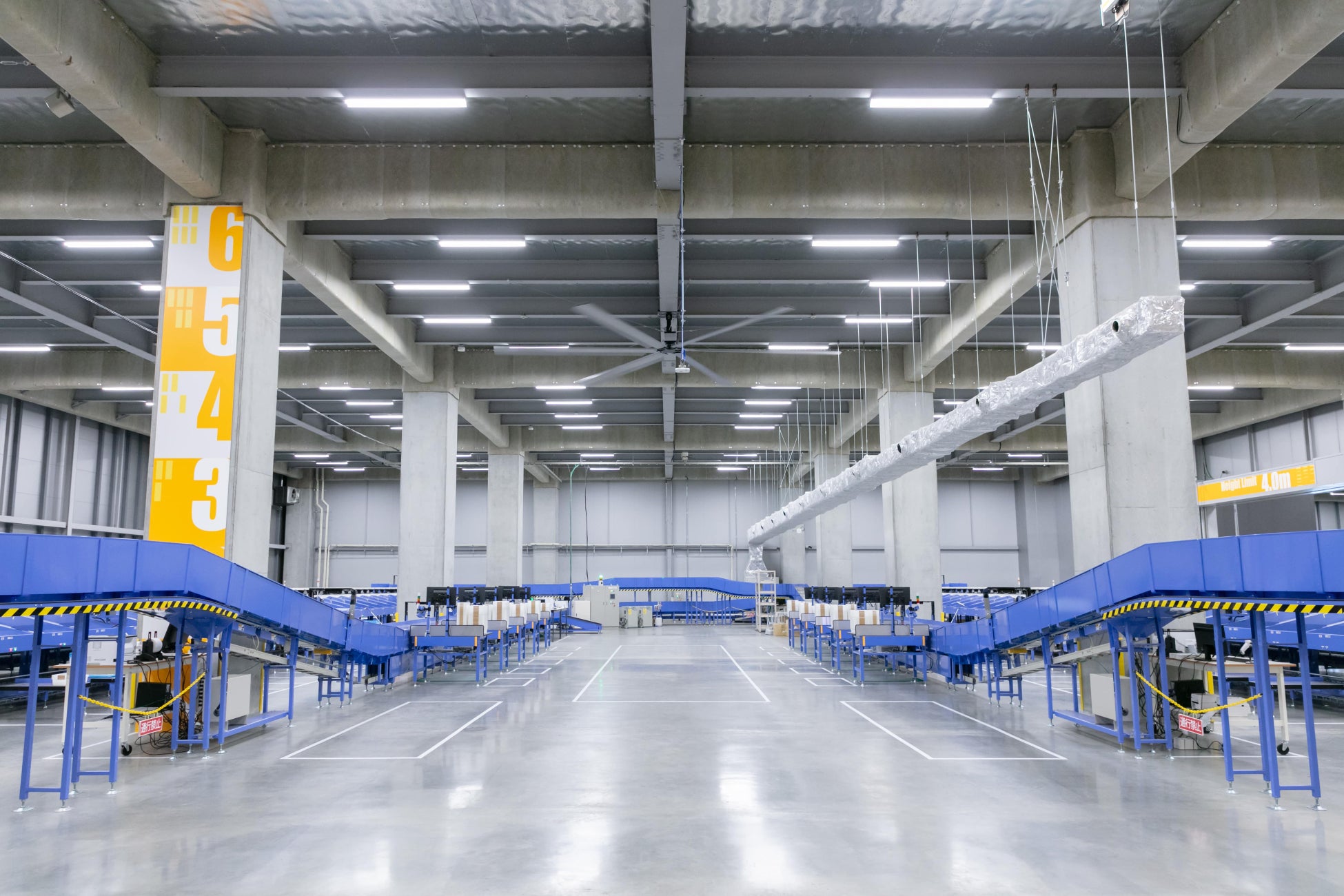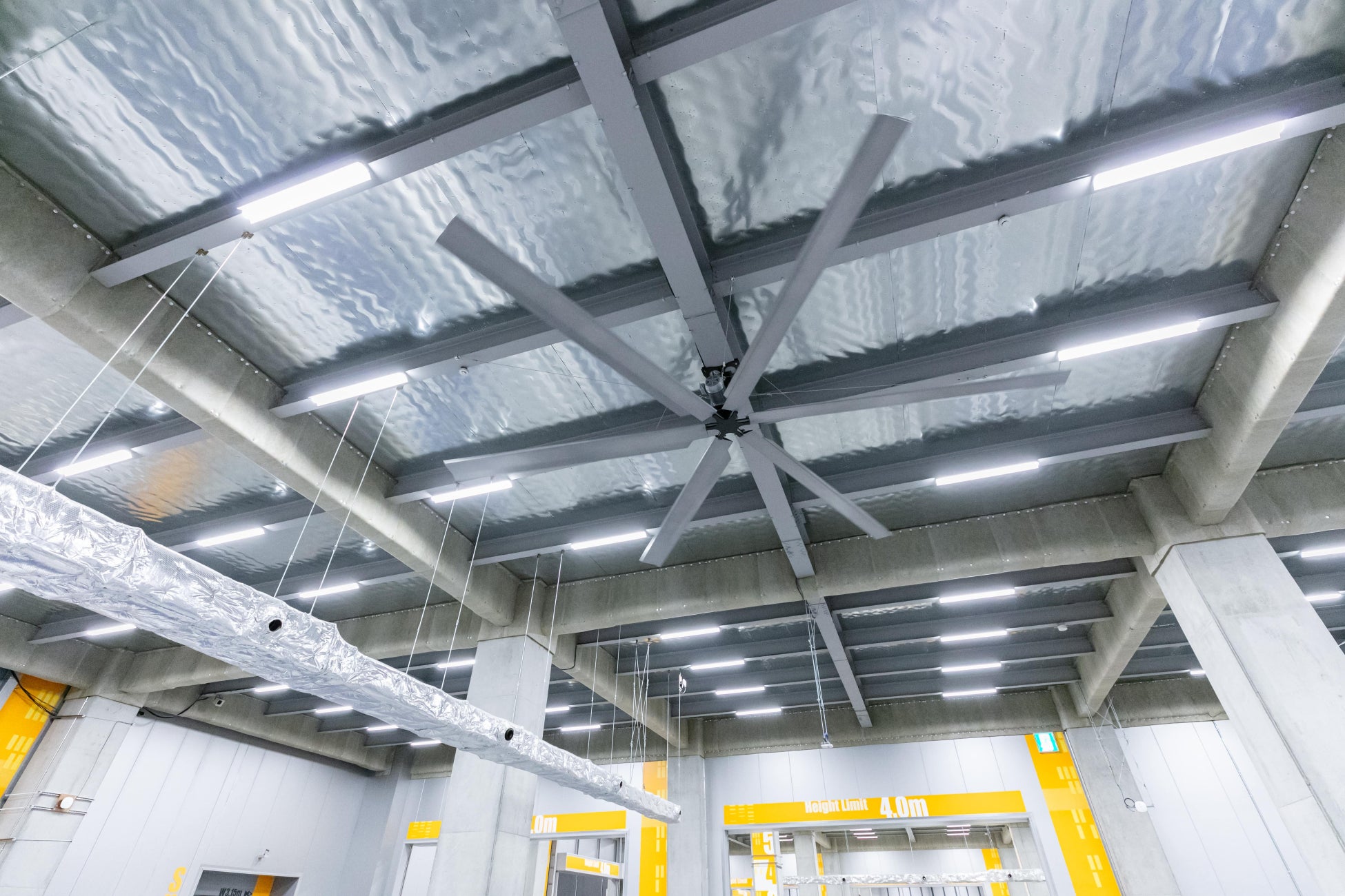 ほかにも大型シーリングファン「HVLSファン」の導入により、作業所内に気流を発生させ、夏期は力強い風が体感を約4度下げ、秋から春までは、天井の暖かい空気を空間全体に行き渡らせて快適さを提供します。それにより、空調電力は従来のセンターと比較しておよそ12%以上の節約が見込まれます。湿度は約6%下がるため、結露対策としても有効です。