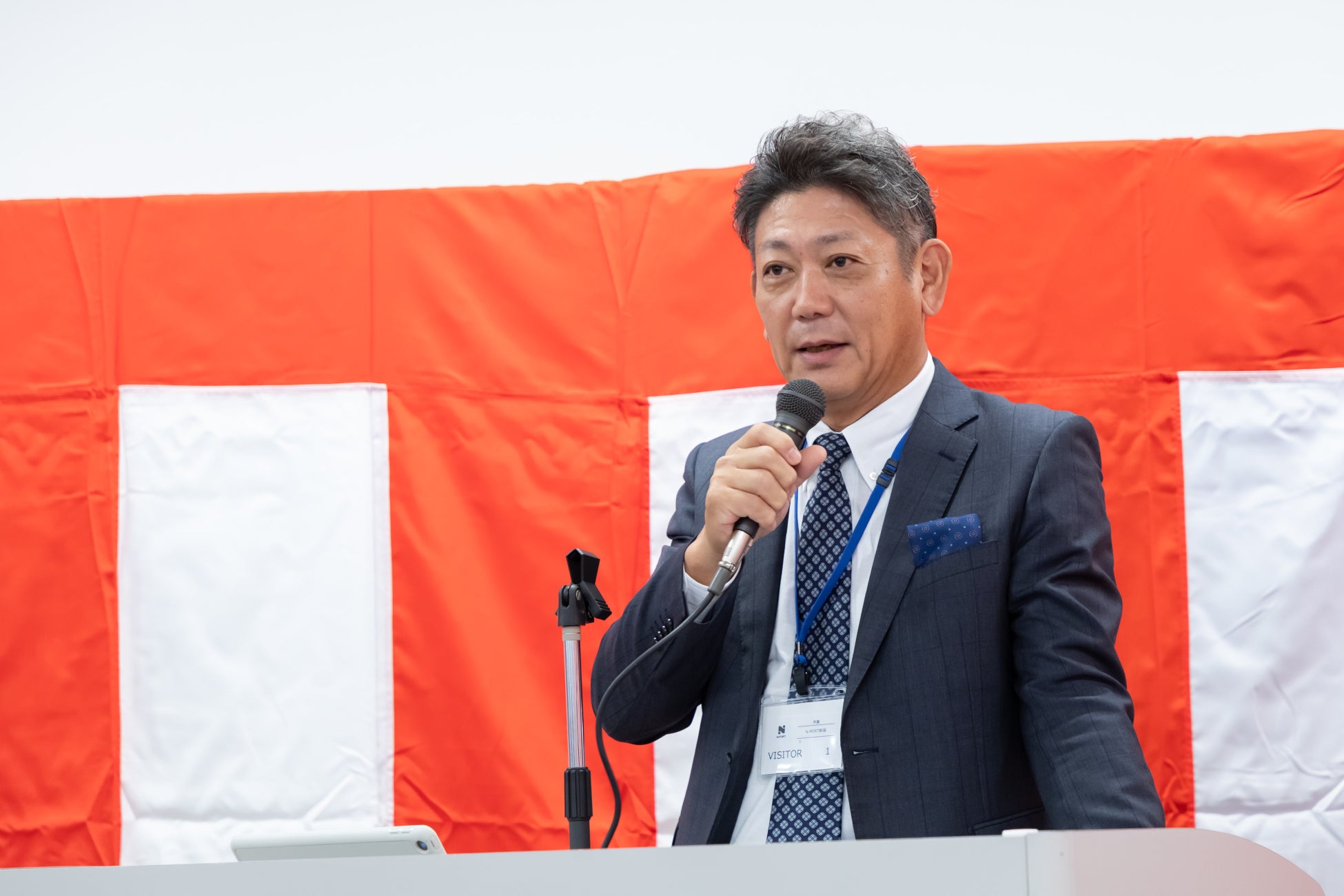 登壇した日販代表取締役社長の奥村からは、無事に開所式を迎えることができたことに対し、列席いただいた全ての皆様のご尽力に感謝を申し上げるとともに、「N-PORT新座は、日販が今まで出版流通で培ってきたノウハウをベースに新たなテクノロジーを加えた、機能的かつ汎用的なセンターです。その機能性と汎用性を生かし、我々の祖業である出版物の取り扱いはもちろんのこと、文具・雑貨を中心としたさまざまなアイテムを扱うことで業量拡大を果たし、日販グループにとっても、お取引先の皆様にとっても『持続可能な出版流通』を実現してまいります」とご挨拶しました。