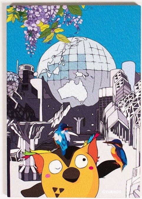 有隣堂公式YouTubeチャンネル「有隣堂しか知らない世界」のMCキャラクター R.B.ブッコローが湘南台の街を楽しんでいる姿をイメージした木製ポストカードです。藤沢市湘南台文化センターの前で藤沢市の市の鳥「カワセミ」とブッコローが、「色がお揃い!」と楽しげにおしゃべりしています。澄み渡る青空に市の花である「フジ」も彩りを添えています。