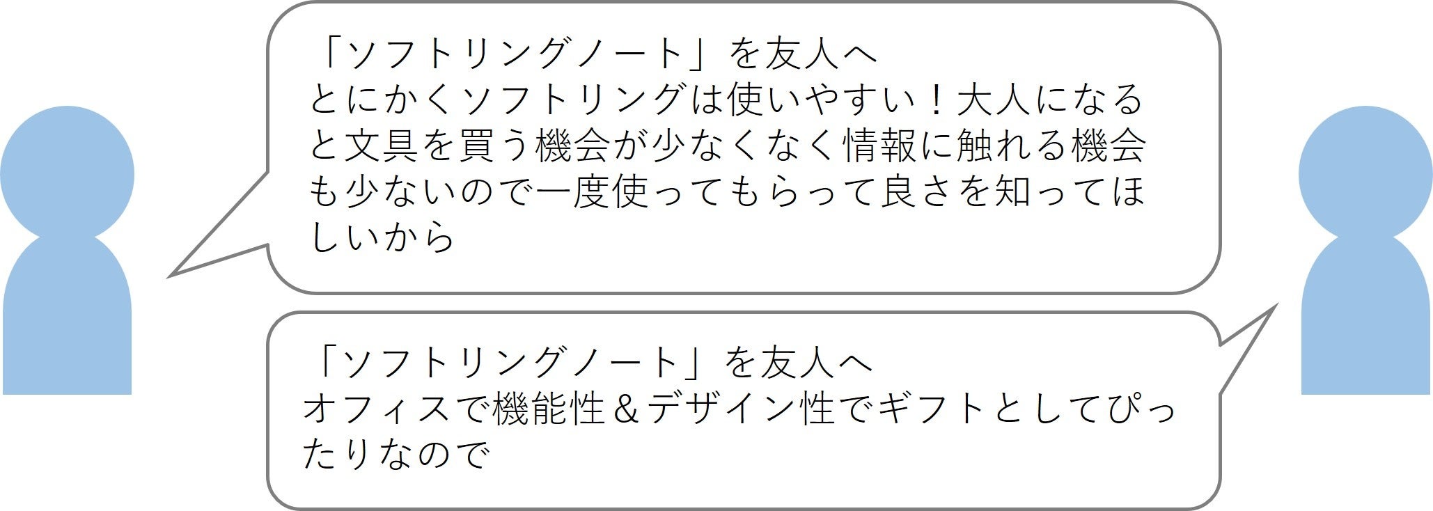 3位の「ソフトリング」シリーズは、あまり気負わずに軽いプレゼントとしてあげることを想定して選ばれました。友人へのプレゼントとして「とにかくソフトリングは使いやすい!大人になると文具を買う機会が少なく情報に触れる機会も少ないので一度使ってもらって良さを知ってほしいから」「オフィスで機能性&デザイン性でギフトとしてぴったりなので」と純粋に使いやすさを共有したいとの想いもあるようです。