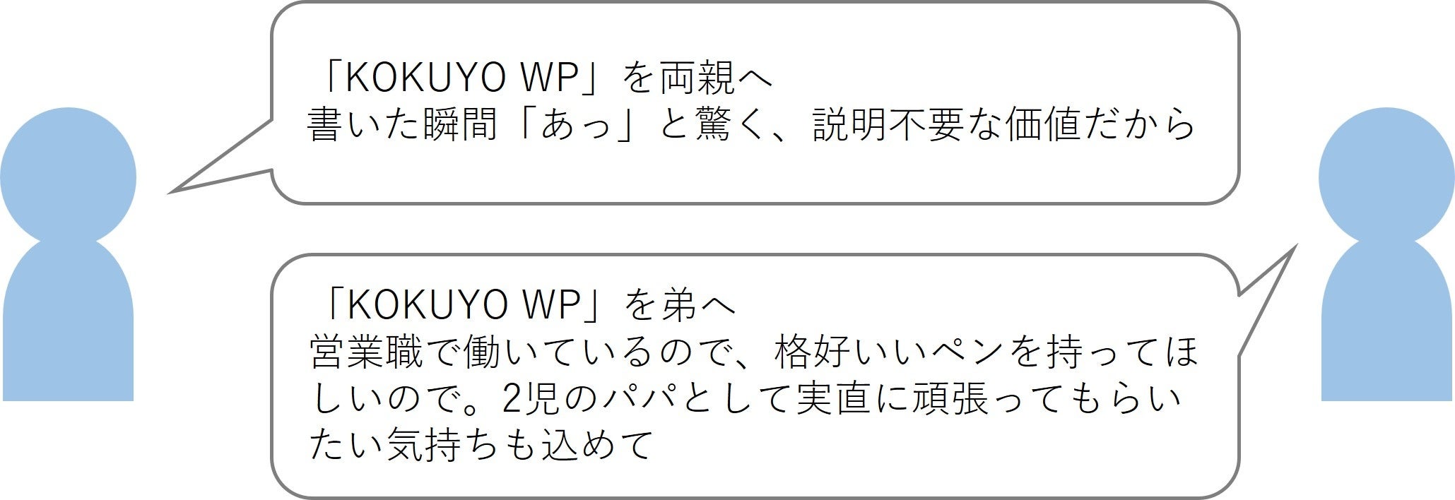 一方、2位の高級筆記具「KOKUYO WP」は、両親や友人、働く弟へなどお祝いやエールの気持ちを込めたギフトとして選ばれました。こちらの選定理由としては、両親へ「書いた瞬間から「あっ」と驚く、説明不要な価値だから」、弟へ「営業職で働いているので、格好いいペンを持ってほしいので。2児のパパとして実直に頑張ってもらいたい気持ちもこめて」とエールを送るなどの理由もありました。