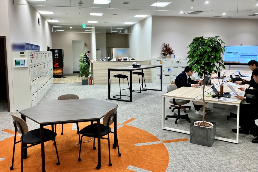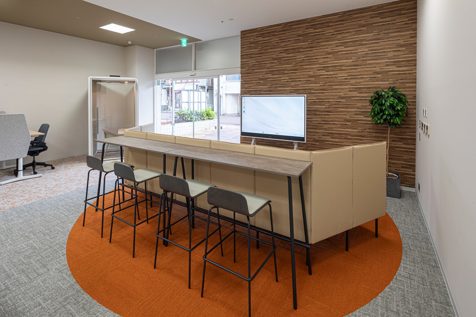 BCP対策を意識したオフィス設計で社員やお客様の安全を確保。ビッグテーブルやスタンディングテーブルといった多様なオフィス家具の配置により、その日の気分によって自由に働く場所を変える事ができるオフィス空間を実現。他部署とのコミュニケーション活性化にも繋がります。