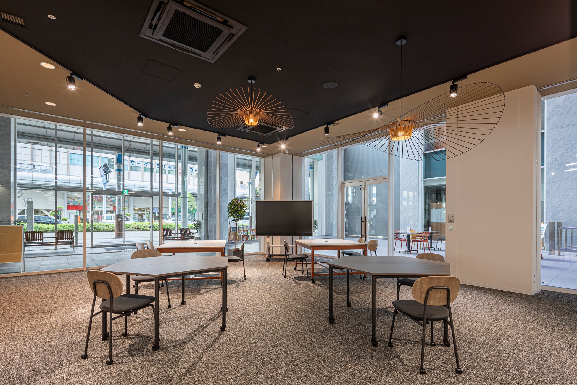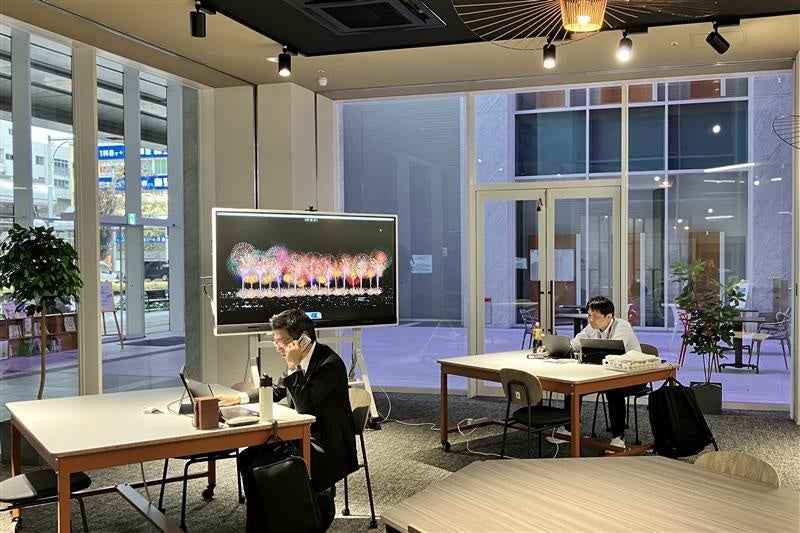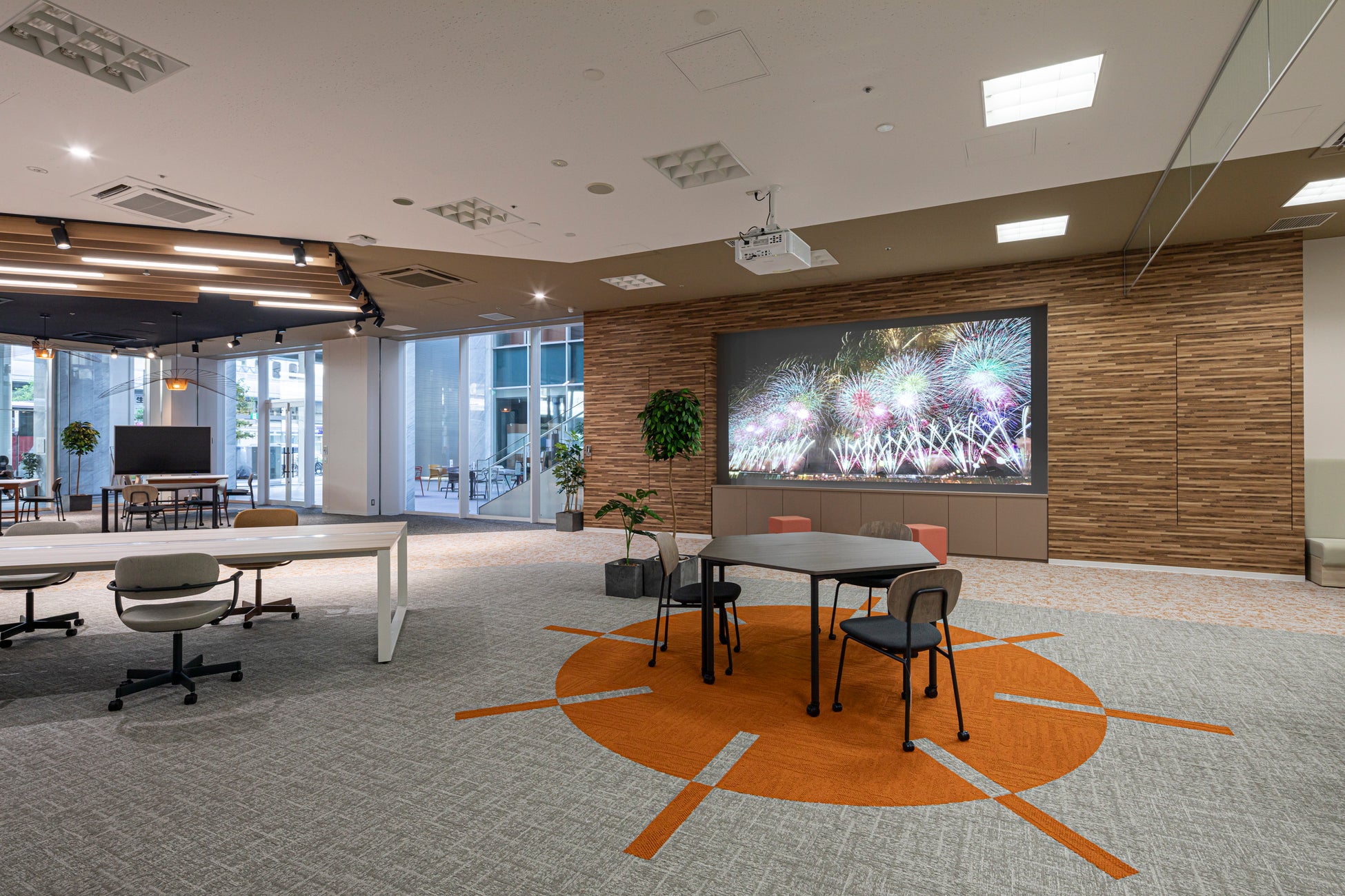 長岡市の象徴である花火をデジタルサイネージに投影し、地元長岡の魅力をリコージャパンから発信します。「NagaokaBase」では、花火をイメージした暖色の照明を使用し、リラックスをしながら仕事ができる空間を実現しました。