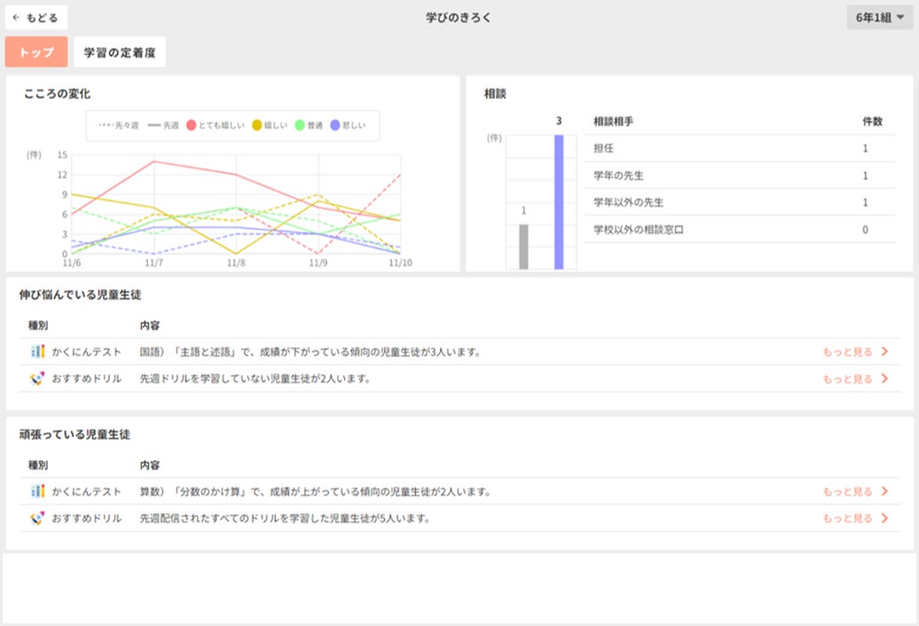 「子ども用」と「先生用」ダッシュボードがそれぞれ用意されており、「子ども用」ダッシュボードでは、子どもたちが自分で「学びのきろく」を振り返り、自分の弱みや強みを把握して学習を進めることができます。「先生用」ダッシュボードではクラス全体や個人ごとの学習進捗や定着度を詳細に把握することができるため、支援が必要な子に気づいたり、理解度に応じて授業の仕方を工夫したりといった形での活用が可能です。