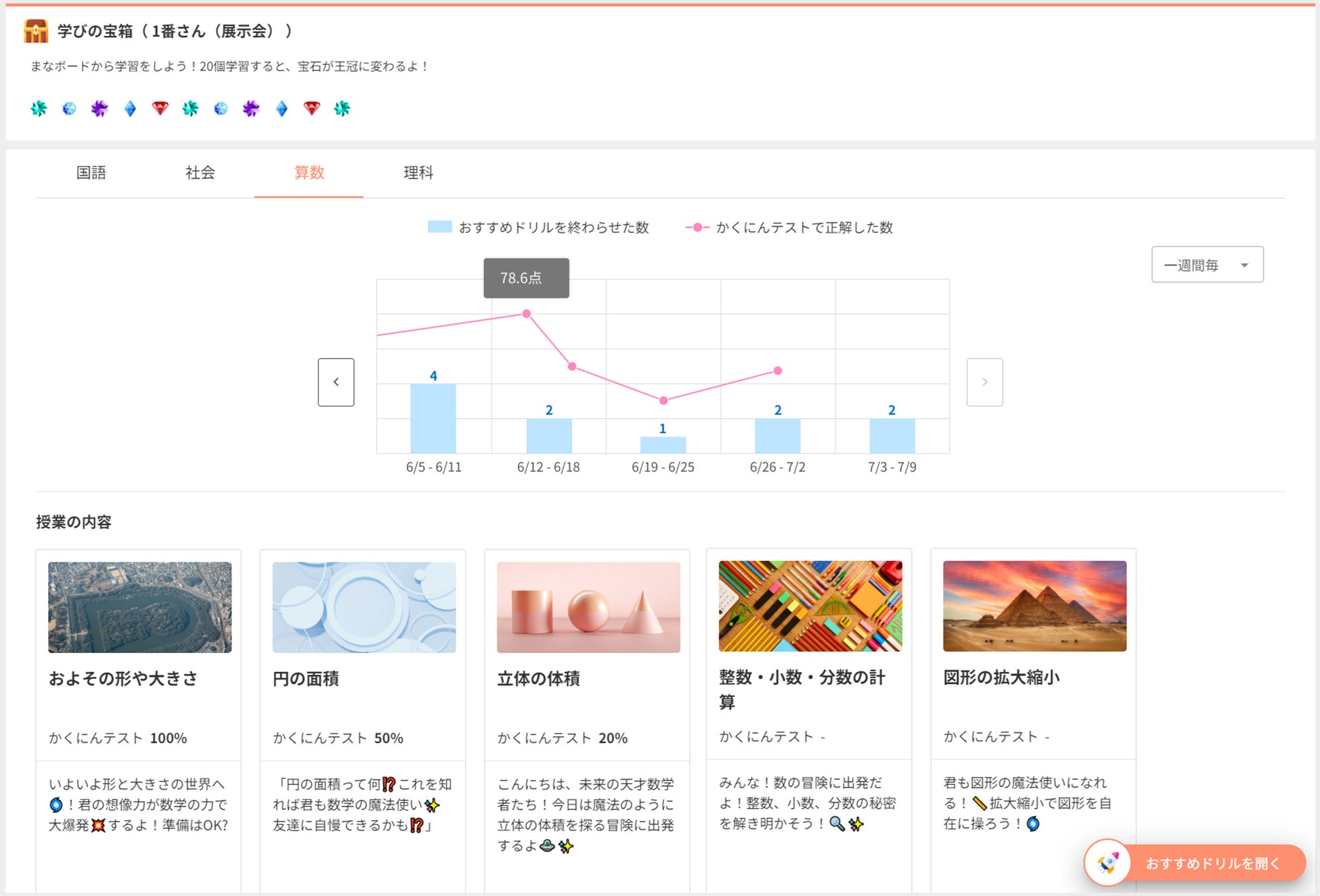 *「学びの宝箱」は「おすすめドリル」に取り組むと宝石がもらえる仕組み。宝石が貯まると王冠に変わり、王冠の数はクラス全体で集約される。