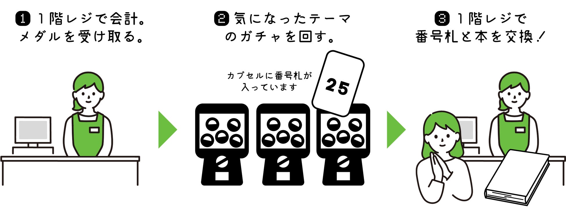 テーマごとに設置されたガチャを回すと、番号札が出てきます。レジで提示すると、本+ノベルティのセットが受け取れます。