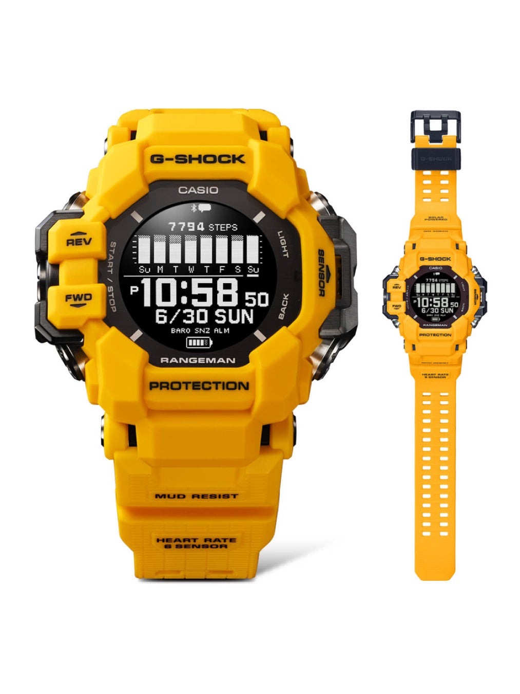 耐衝撃ウオッチ“G-SHOCK”の中でも、防塵・防泥構造を持つサバイバル仕様の“RANGEMAN(レンジマン)”シリーズのモデルです。光学式心拍センサーなど6つのセンサーとGPS機能を搭載し、過酷な自然環境下での状況把握を可能にしました。落下や衝突から守る、3時、9時位置の大型のメタルガードや、暗闇やグローブの状態でも操作が可能で、泥水なども排出しやすいマッドレジストボタンを装備。実用での操作動線から必然的な形状を導き出し、“RANGEMAN”シリーズの新たなデザインアイコンを完成させました。