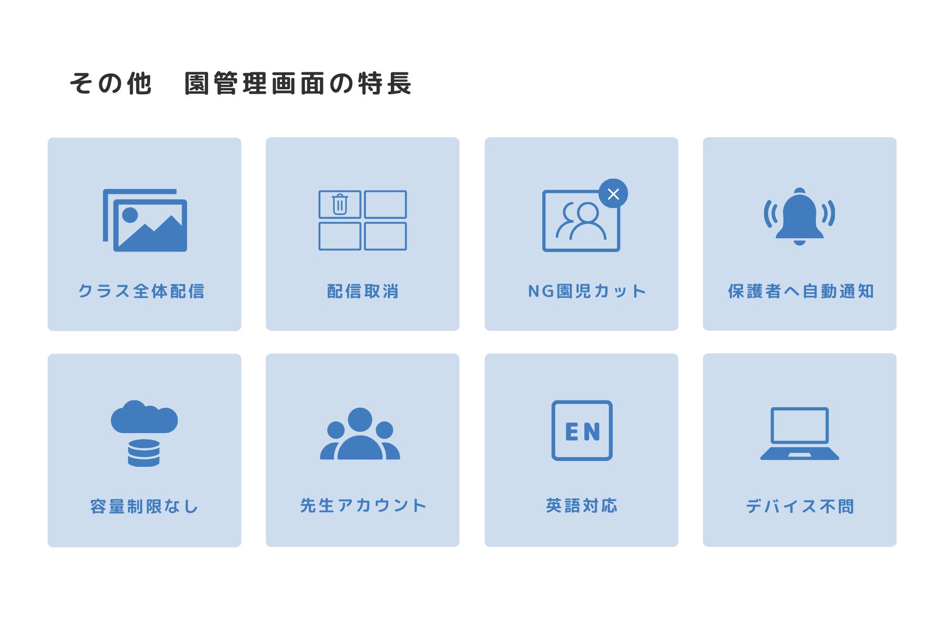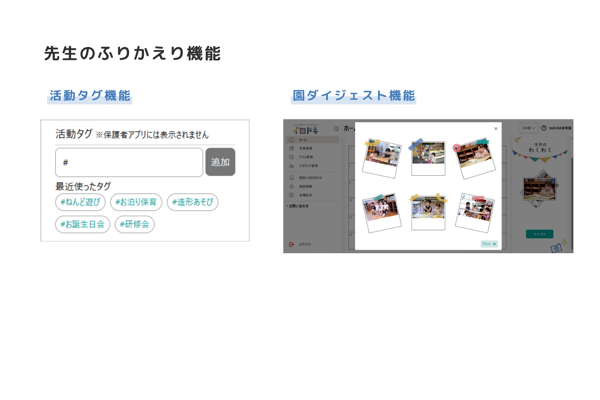 3つの特長に加え、園の管理画面では日付や園児ごとに写真検索も可能なため、園での写真管理をより簡単に行うことができます。活動タグ機能や園ダイジェスト機能など先生のふりかえりにもご活用いただけます。「イロドキⓇ」のネーミングに込めた「子どもたちの彩りあるわくわくドキドキの瞬間(とき)を届ける」ことで、子どもたち一人ひとり“今”にもっと寄り添える環境づくりをサポートしてまいります。
