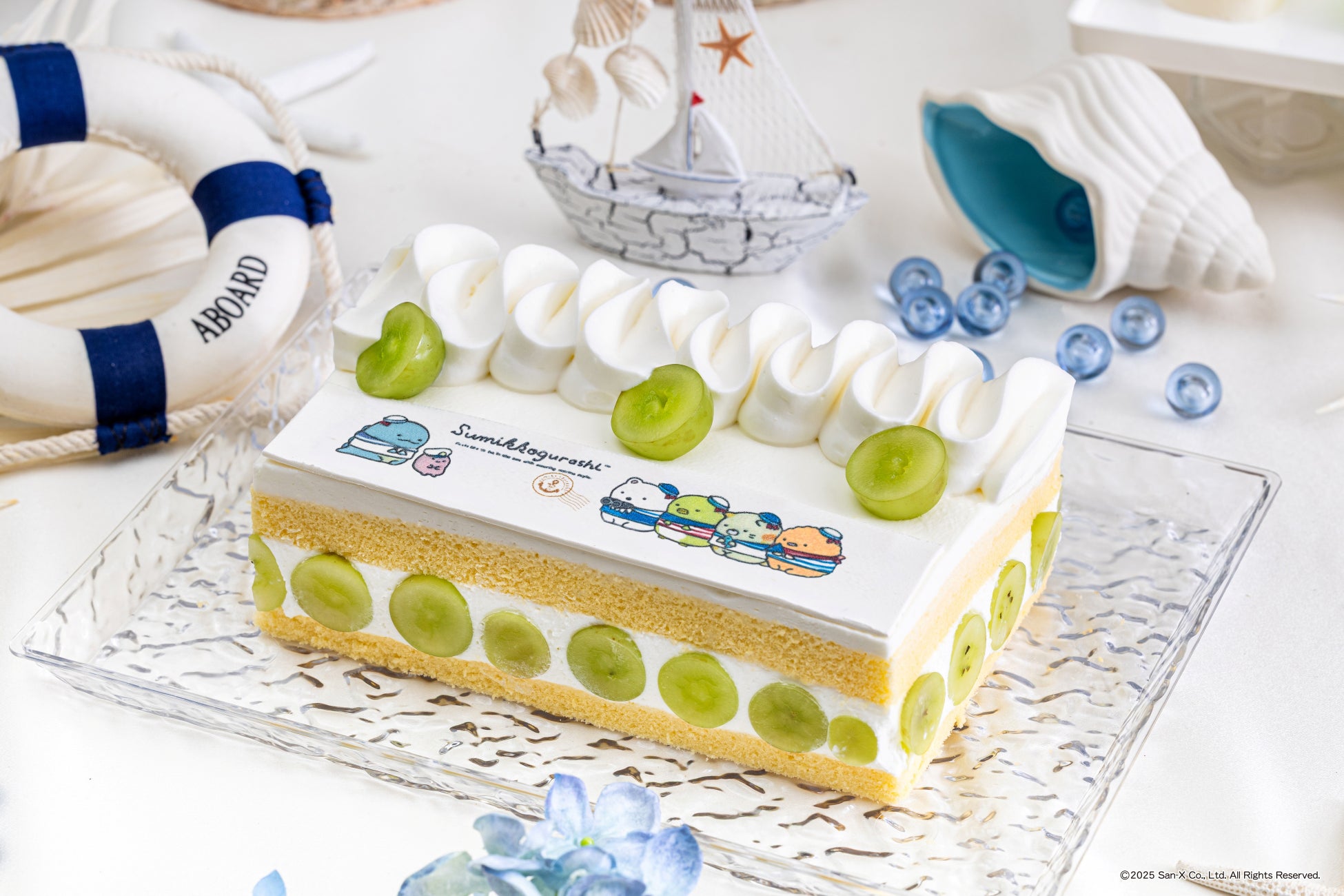 マリンパーティを彩る「すみっコショートケーキ」は、ふわふわとした食感の生地に瑞々しいシャインマスカットを乗せ甘さ控えめの軽やかな生クリームを絞った素材の味を活かしたシンプルな一品です。