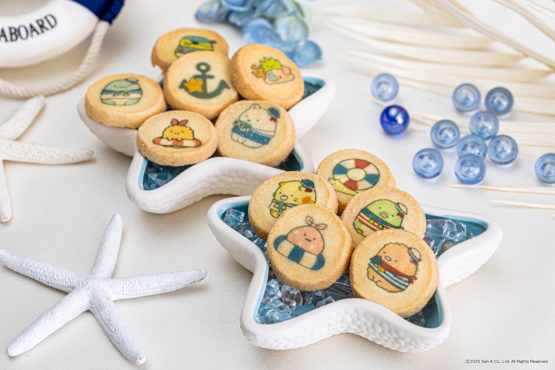 バニラの香りが豊かなクッキー。マリンスタイルに身を包んだ様々な表情のすみっコたちをあしらったミニクッキーです。