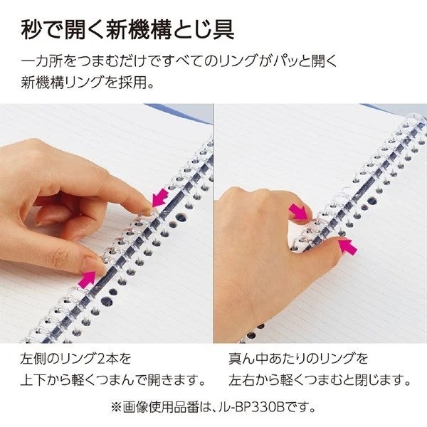 1カ所をつまむだけですべてのリングがパッと開くリングを採用し、片手操作でも軽く開けられるバインダーです。従来品よりもとじ具が斜めに大きく開くので、ルーズリーフが出し入れしやすいです。B5サイズのルーズリーフに対応しています。