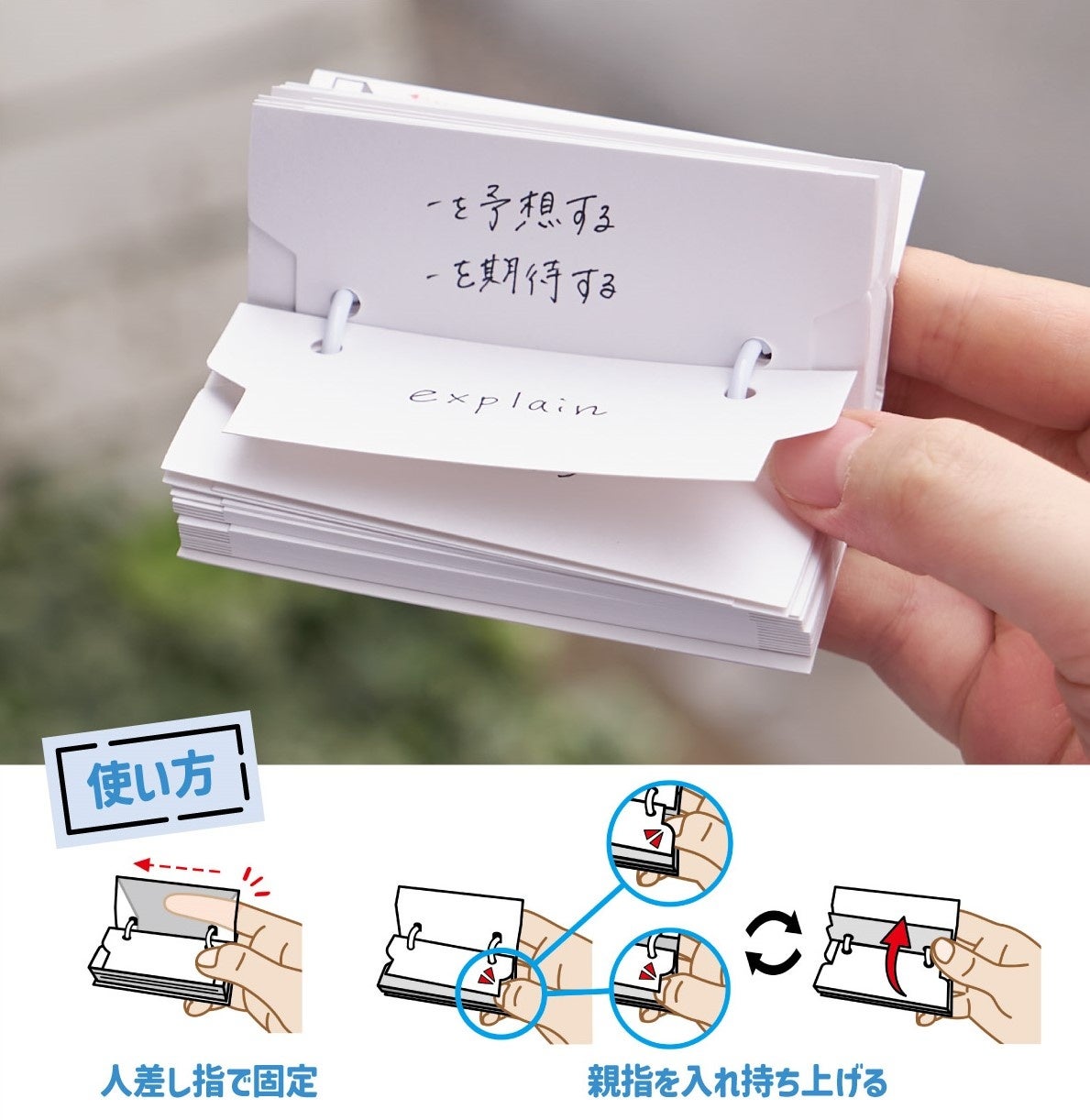 片手でめくることができ、すきま時間に鞄からさっと出して勉強するのにぴったりな単語カードです。リングの向きを変えることで、表紙と中紙がまとめられるためばらつかないほか、右手と左手どちらでも使える仕様です。