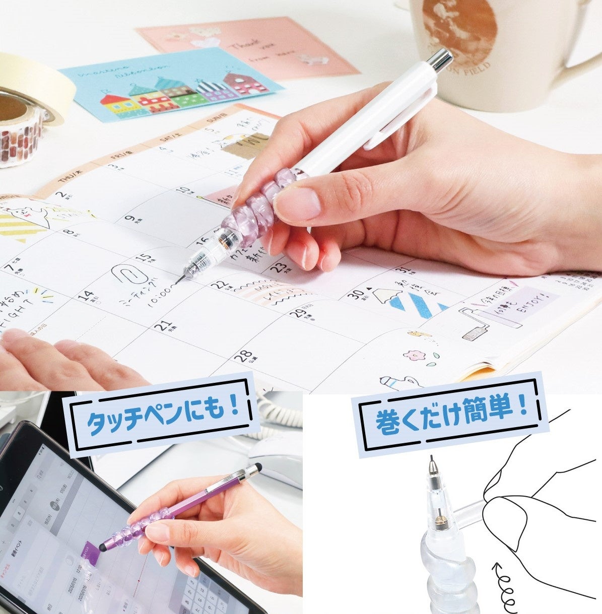 細軸でも太軸でも、ボールペンやタッチペンなどにくるくる巻けるペンシルグリップです。やわらかいエラストマー素材で疲れにくく、スパイラル形状が指にフィットします。巻くだけで付けられるので、タッチペンの充電時なども付け外しが簡単です。