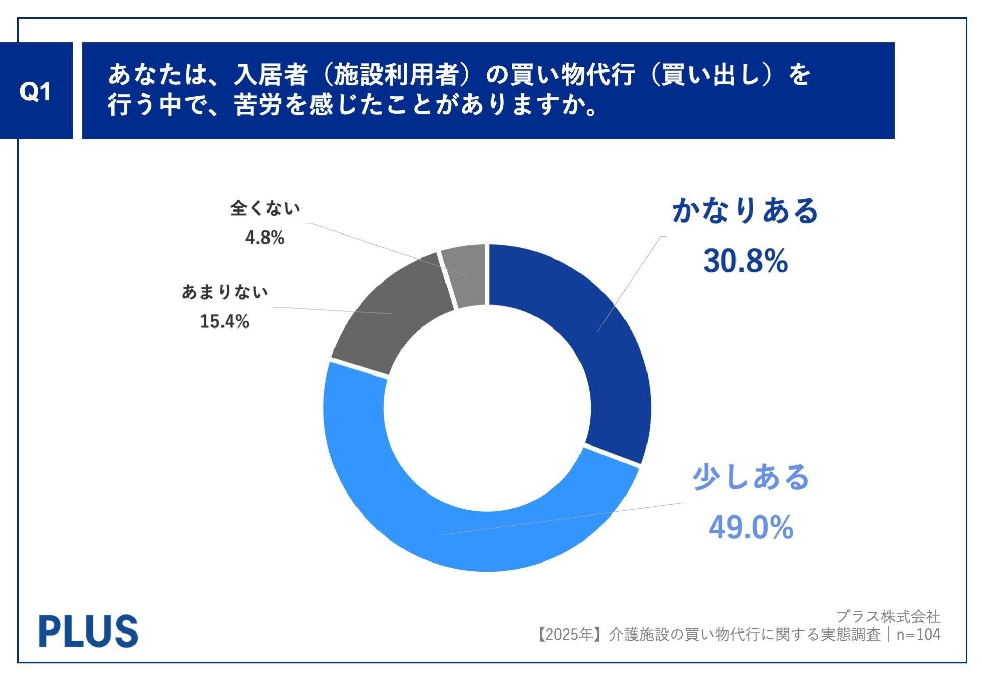 「Q1.あなたは、入居者(施設利用者)の買い物代行(買い出し)を行う中で、苦労を感じたことがありますか。」(n=104)と質問したところ、「かなりある」が30.8%、「少しある」が49.0%という回答となりました。