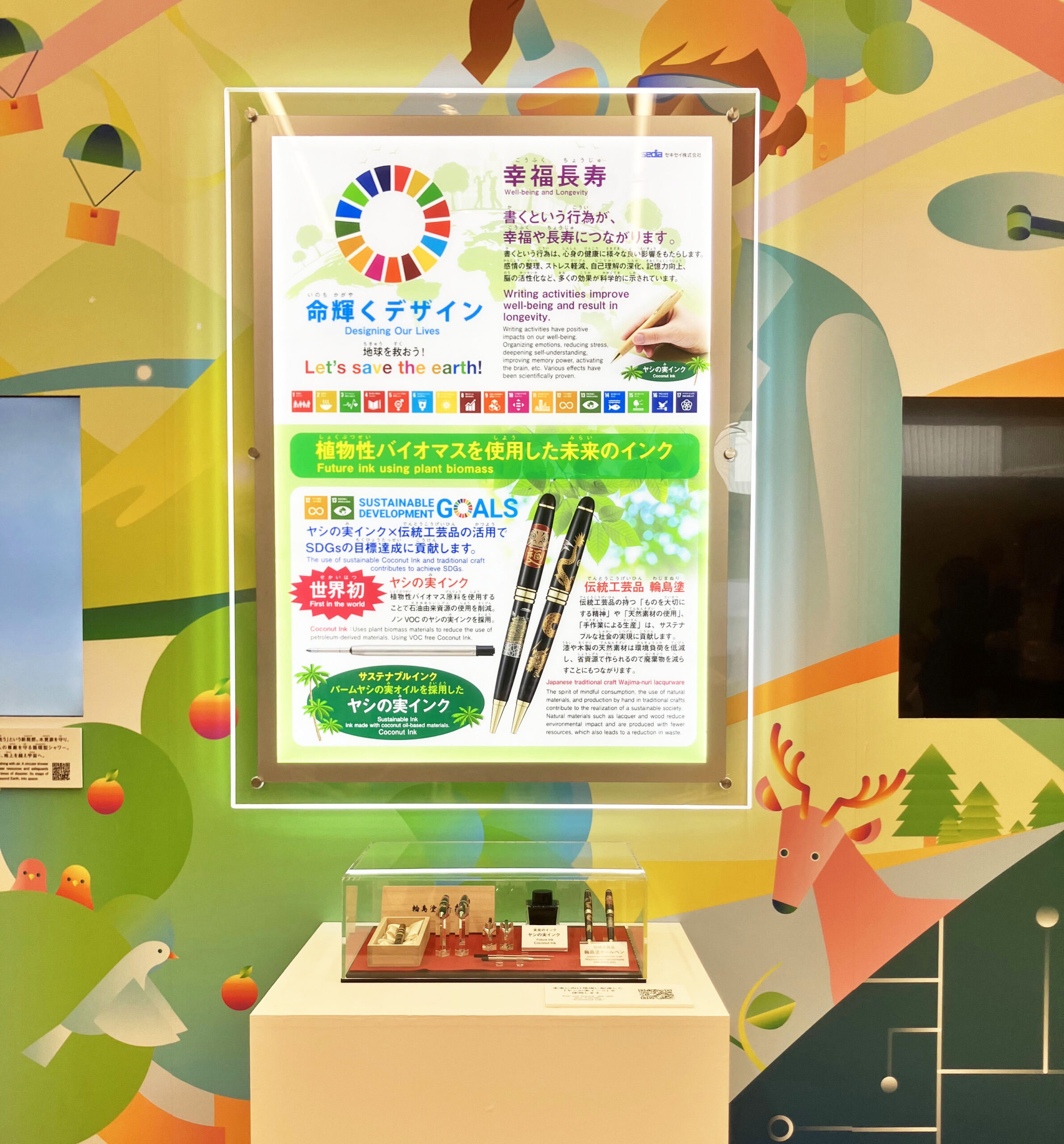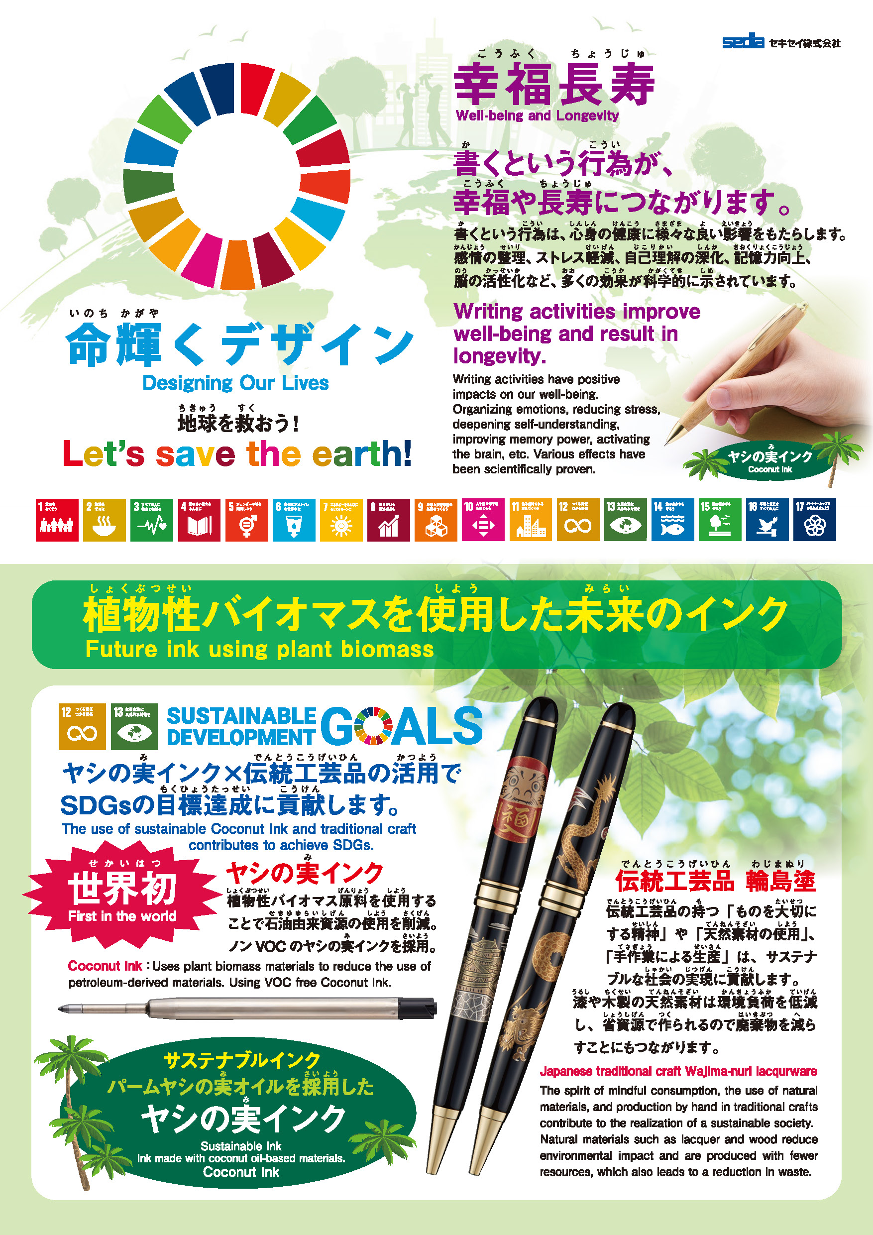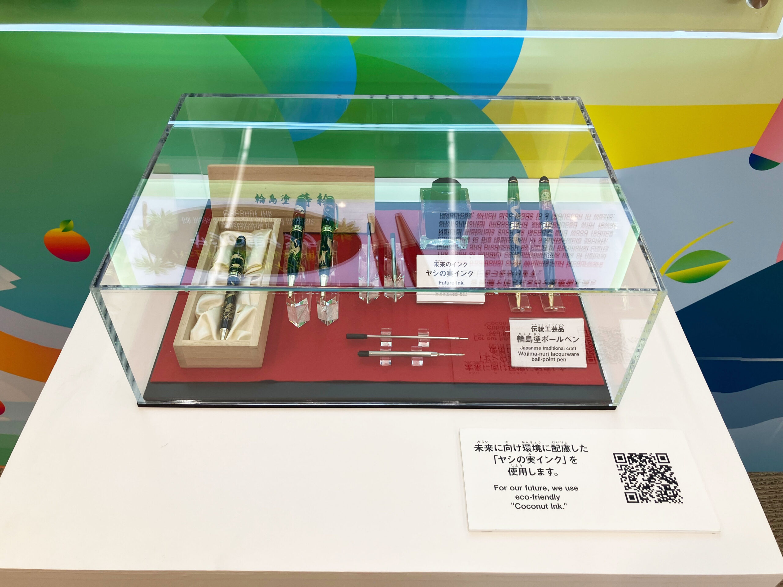 セキセイ株式会社がリボーンチャレンジで展示をする内容については雅風ボールペンとヤシの実インクの実物展示で、輪島塗の特色である漆黒の深い黒や繊細な蒔絵の表現を実際に確かめていただくとともに、CO2 の削減や廃棄インクの再利用といった環境に配慮したサステナブルインク(ヤシの実インク)の特性を知っていただきます。書くという行為が幸福や長寿につながっていくことをパネルなどで来場者にお伝えします。