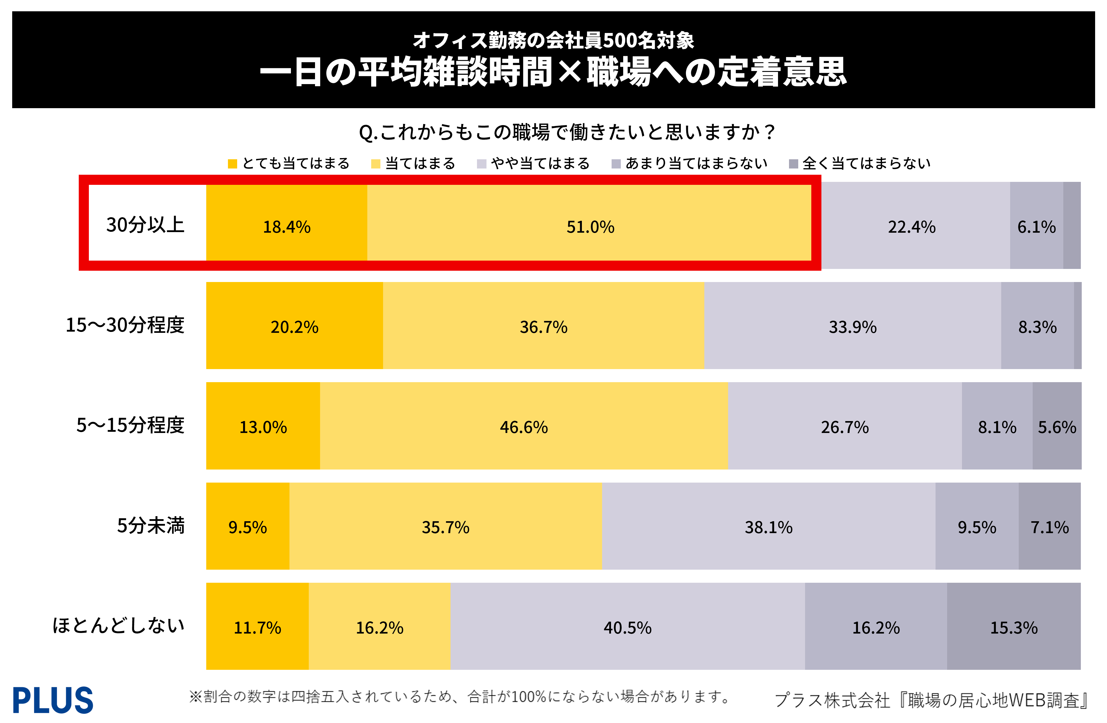 30分以上雑談している人は、そうでない人に比べて「今の職場に満足している」と答える割合が高い傾向が明らかに。