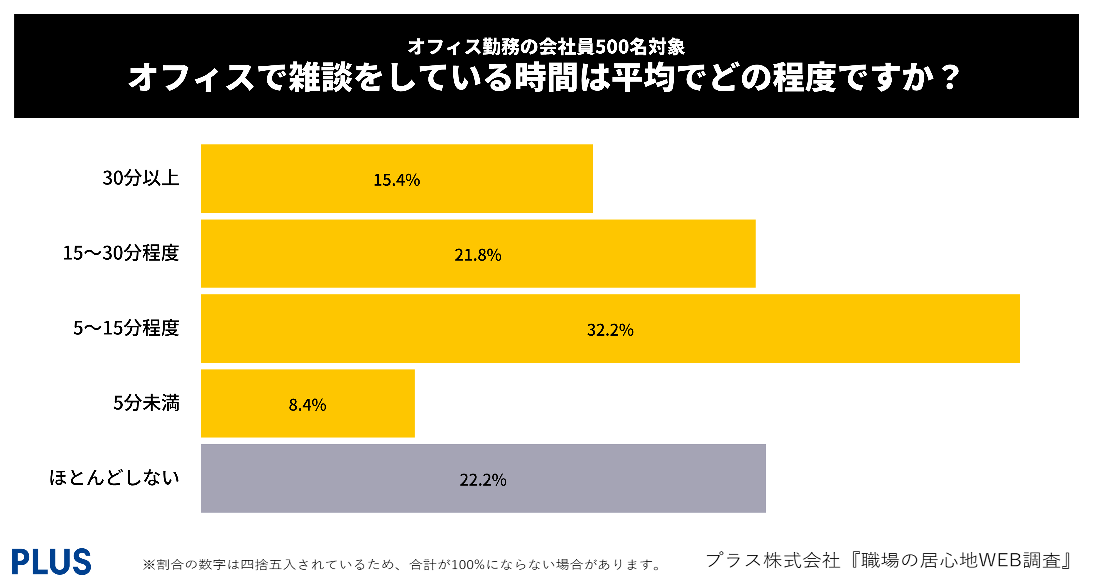 プラス株式会社ファニチャーカンパニー(東京都渋谷区)は、『職場の居心地WEB調査』と題し、従業員数100名以上の職場で働くオフィス勤務の会社員500名を対象に「オフィスでの雑談」についてのWEB調査を実施いたしました。その調査結果を発表いたします。
