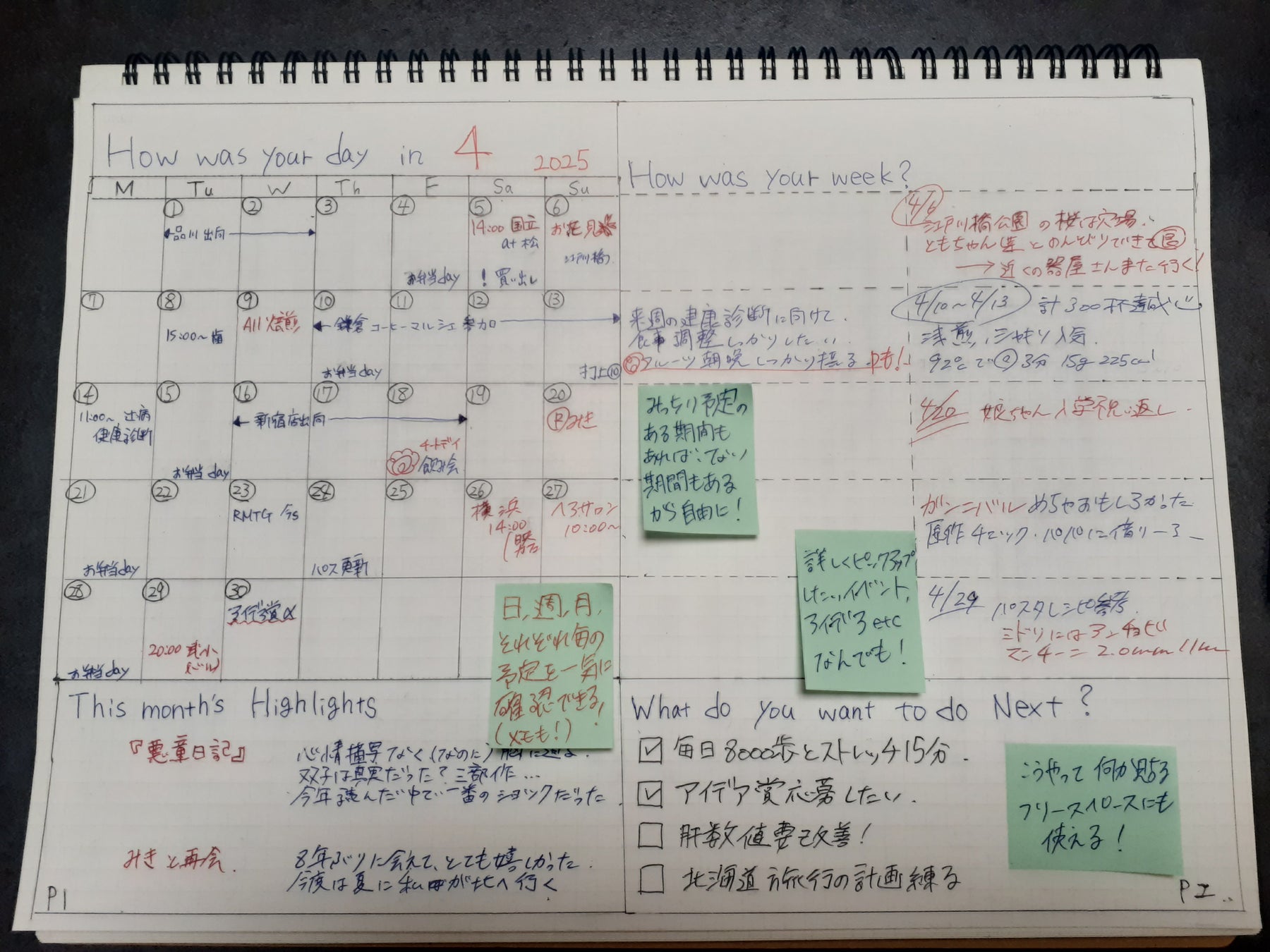 左ページに日ごとの予定をざっくり書き込み、右ページには週や数日のハイライトやメモを自由に残せます。下部には月の総まとめや目標などを見返せます。