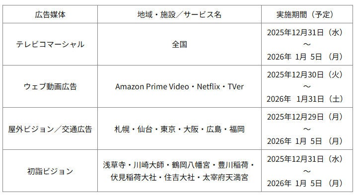 本動画は、年末年始を中心に、テレビコマーシャルやウェブ動画広告に加え、主要都市の屋外ビジョン(※1)や交通広告、さらには数多くの参拝客が訪れる寺社の初詣ビジョン(※2)でも展開します。テレビコマーシャルにおいては、アクセシビリティの観点から、字幕表示に対応しました(※3)。また、本日12月19日より、当社ウェブサイトの広告ライブラリー(https://jp.sharp/cm/)でもご覧いただけます。