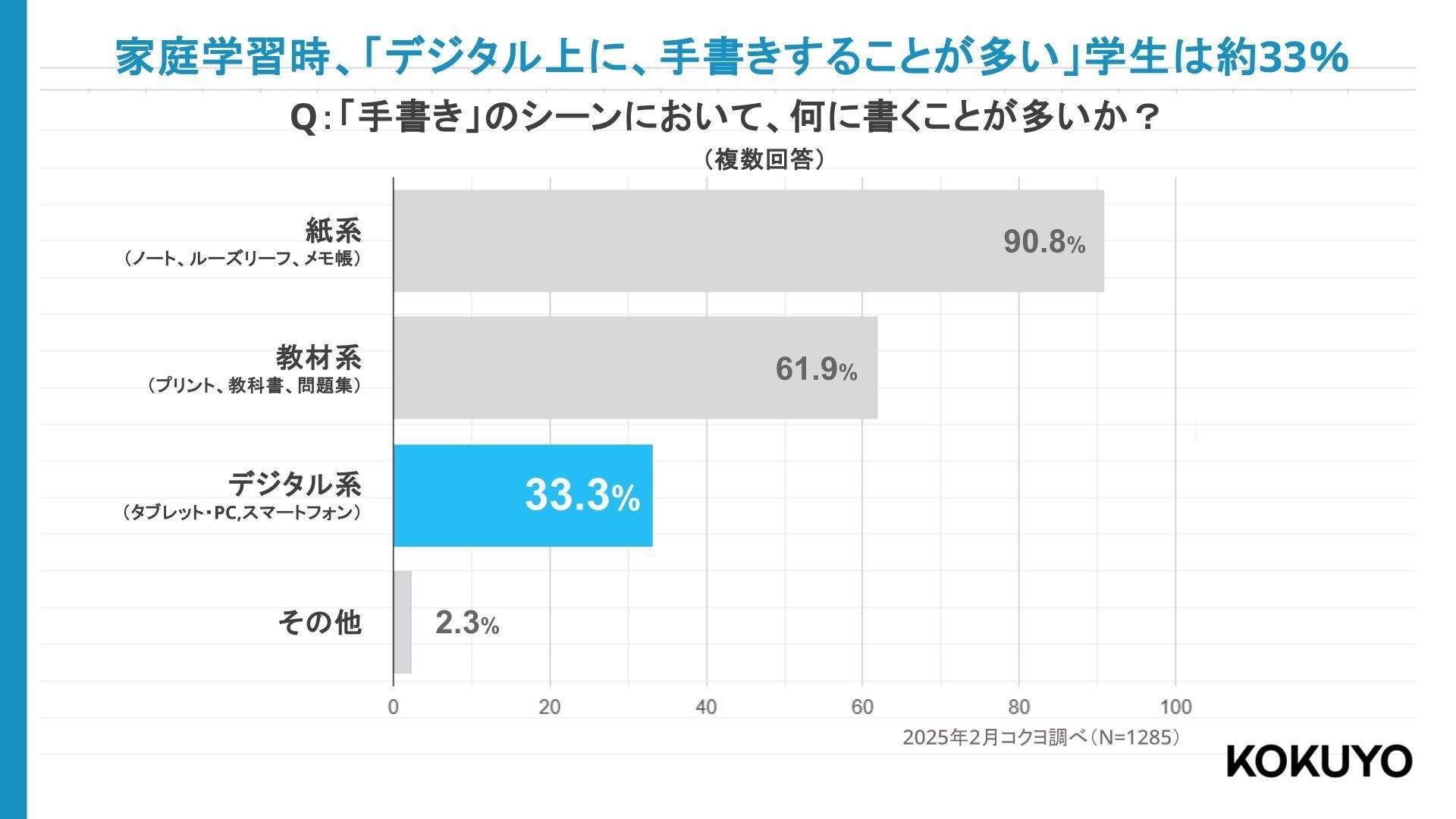 家庭学習時の「手書き」のシーンにおいて、何に書くことが多いか?とのいう質問に対して、「紙系(ノート、ルーズリーフ、メモ帳)」(90.8%)、「教材系(プリント、教科書、問題集)」(61.9%)、「デジタル系(タブレット・PC、スマートフォン)」(33.3%)と回答。