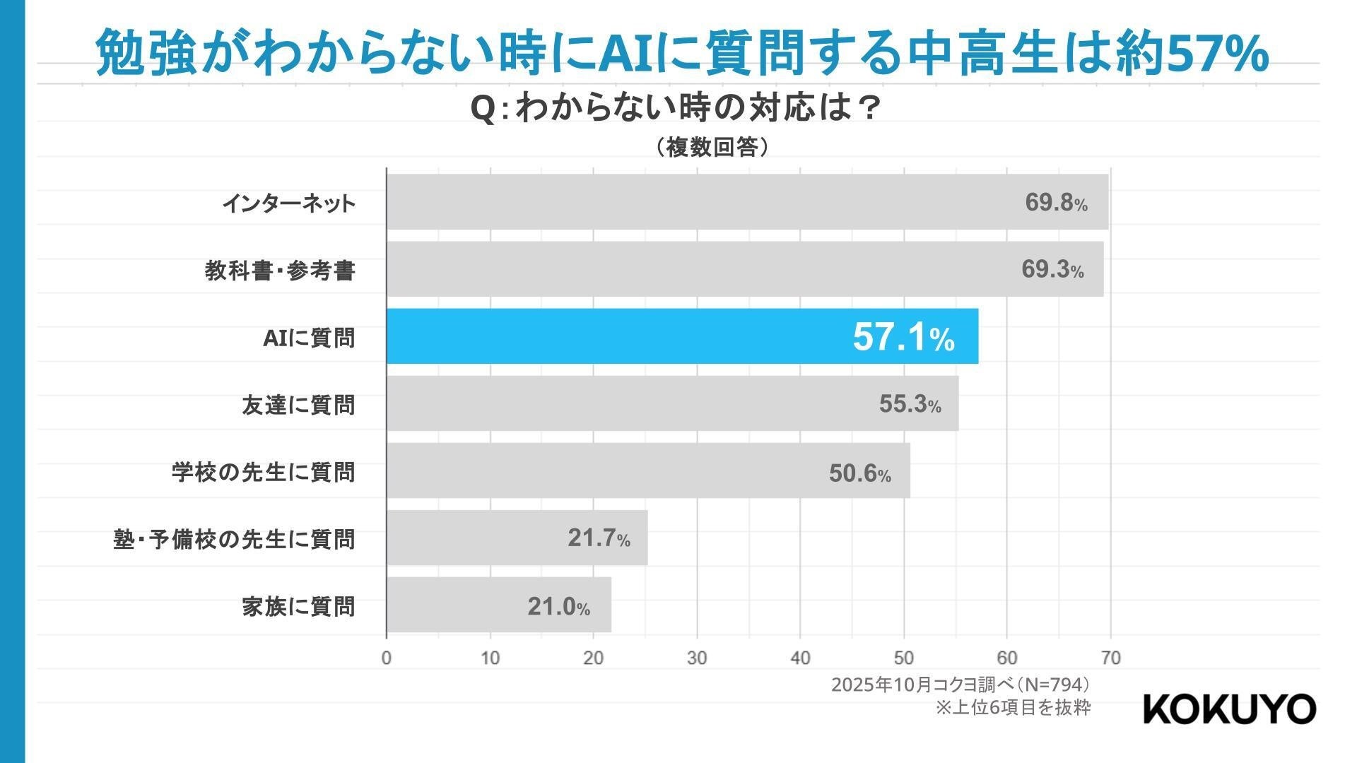 ・「わからない問題はAIに質問」が57%。インターネット(69.8%)や教科書・参考書(69.3%)に次いで、3位。先生や友達に質問するように、AIに質問をして解決を図るという、新しい学習方法の定着が見られる結果に。