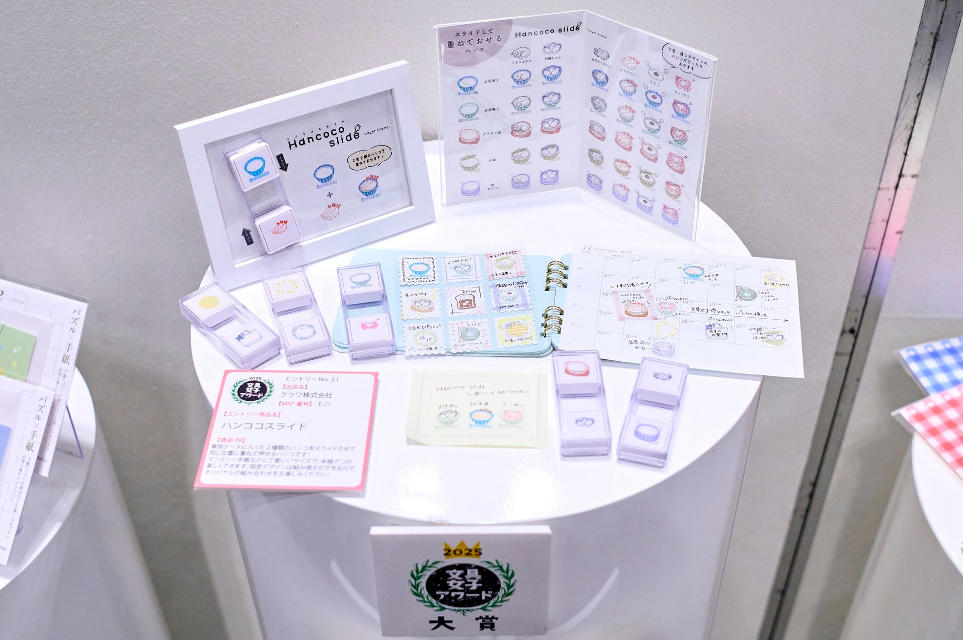 「文具女子博2025」会場内には各社がエントリーしたイチオシの文具が展示され、お客様に「これは良い!」と思った商品に投票していただきました。今年は過去最大数の112点の商品がエントリー。見事大賞に選ばれたのは、クツワ株式会社の「ハンココスライド」!専用ケースに入った2種類のハンコをスライドさせて同じ位置に重ねて捺せるハンコです!スライドさせるだけなのでズレが少なく、2色2柄のハンコを綺麗に捺すことができます。マンスリー手帳などに丁度いいサイズで、手帳デコやライフログにもぴったりなアイテム。大賞受賞、おめでとうございます!!
