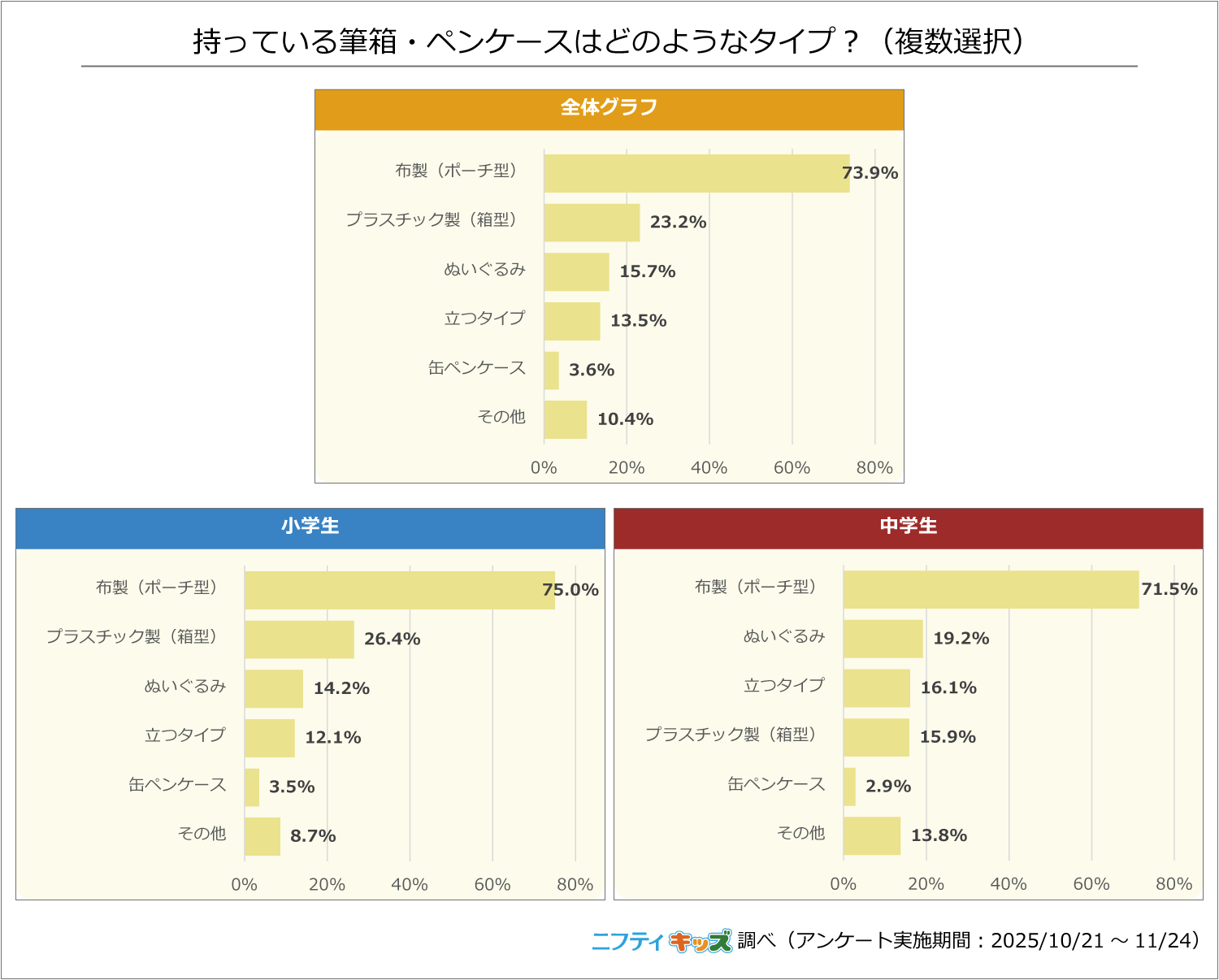 学校や周りの友達の間で流行している文房具としては、さまざまな商品が挙がり、特定のメーカーの商品やぬいぐるみ型の筆箱(ポーチ)が流行っているという声がありました。ぬいぐるみ型の筆箱は、現在使っている筆箱のタイプを聞いた質問で中学生では2位、小学生では3位にランクインしています。