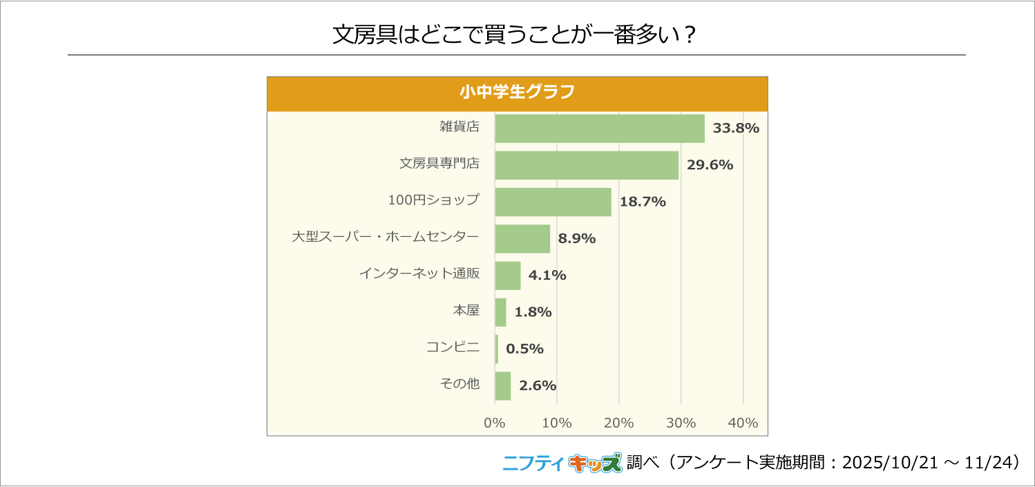 文房具を買う時に一番重要視する点は、小学生ではデザイン、中学生では使いやすさでした。また、小中学生が文房具を買うタイミングは「気に入ったものを見つけた時」が最も多い回答となりました。購入する場所は雑貨店が一番多く、インターネットで買う人はあまり多くない傾向が見られます。