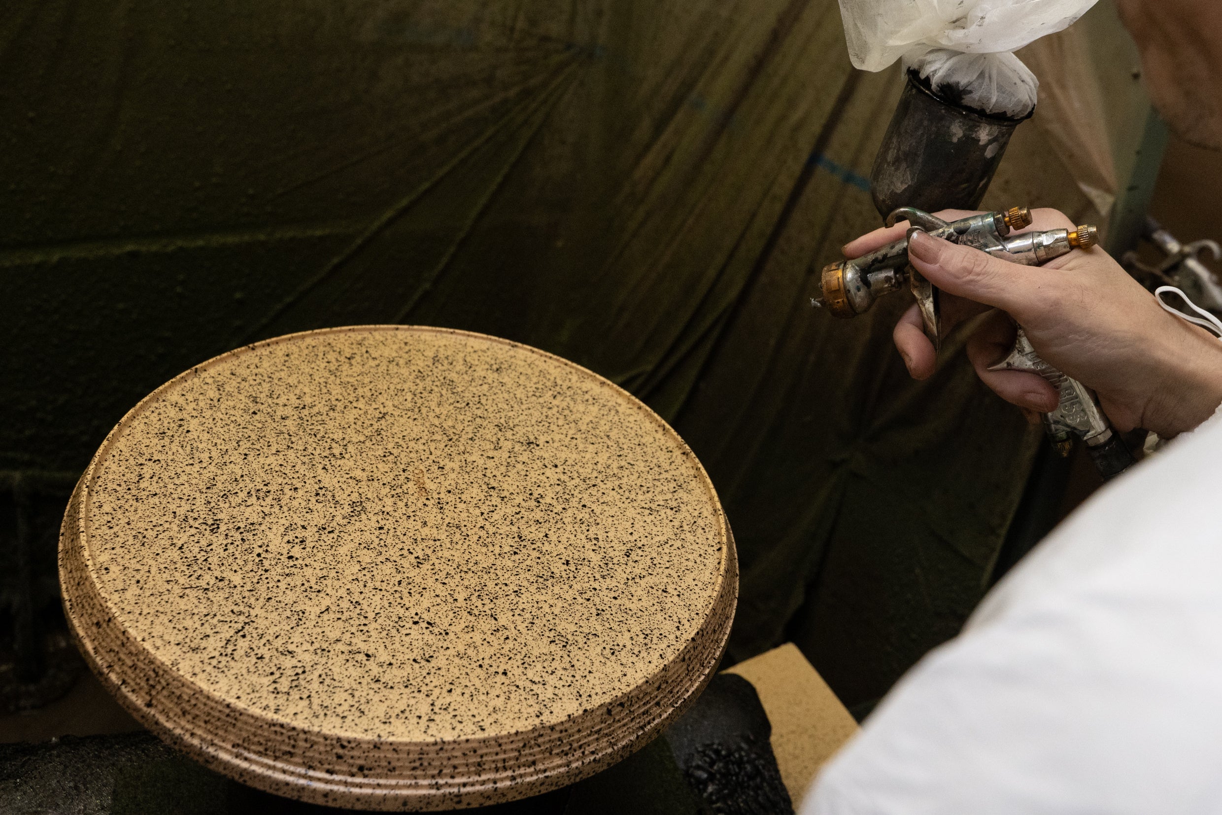 漆器づくりで磨かれた繊細な感覚と高度な塗装技術をもとに、塗料の粒子や層を緻密に重ねることで、本物の石のような重厚さや、しっとりとしたマットな風合いが生み出されます。一吹きごとに指先のわずかな動きや距離を調整しながら、面の表情を立ち上げていく。その積み重ねによって、二つと同じものはない、唯一無二の石目が静かに立ち現れます。