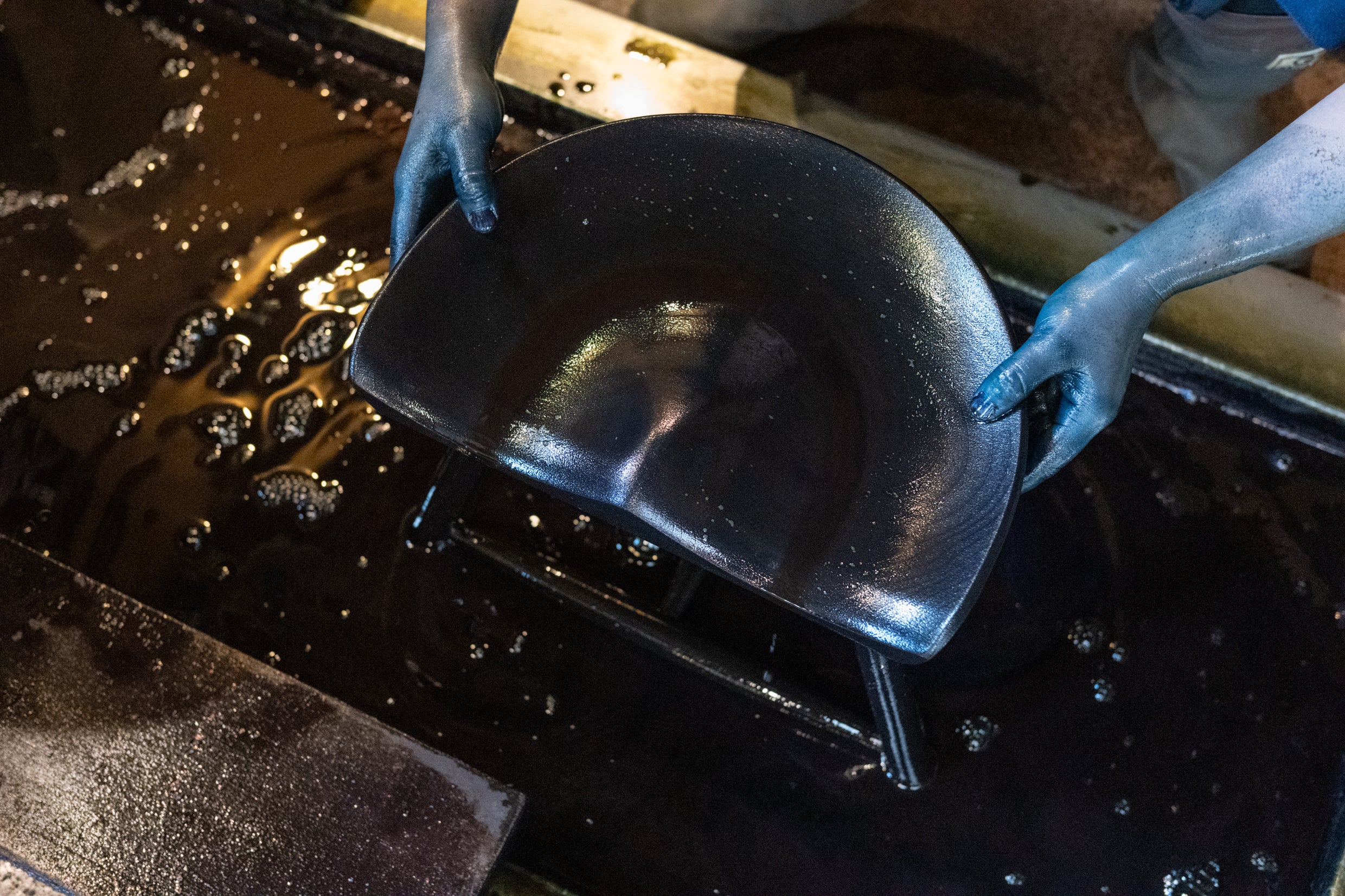 天然藍を灰汁で発酵させて育てる藍甕(あいがめ)には、日々の手入れと環境の変化を映し取るように、職人の気配が静かに宿ります。布や素材を染液に沈め、空気に触れさせる工程を幾度も重ねることで、阿波藍特有の深く澄みわたる青が立ち上がります。温度・湿度・pHといったわずかな変化を読み取りながら、職人の研ぎ澄まされた感覚によって、繊細な濃淡や、まるで呼吸するように揺らぐ藍の表情が生み出されます。