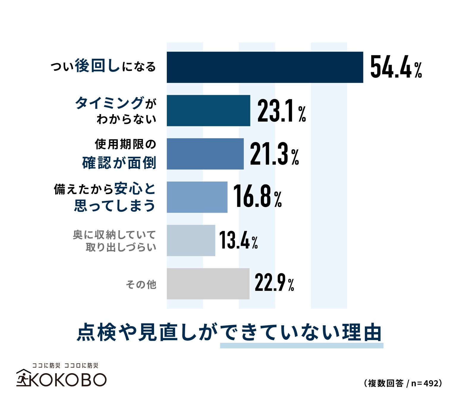 さらに、「点検や見直しができていない理由」(複数回答)という質問に対しては、「つい後回しになる」が54.4%で最も多く、次いで「タイミングがわからない」が23.1%、「面倒」が21.3%と続く結果となり、 防災用品を備えるだけでなく維持することのハードルが高いことがうかがえます。
