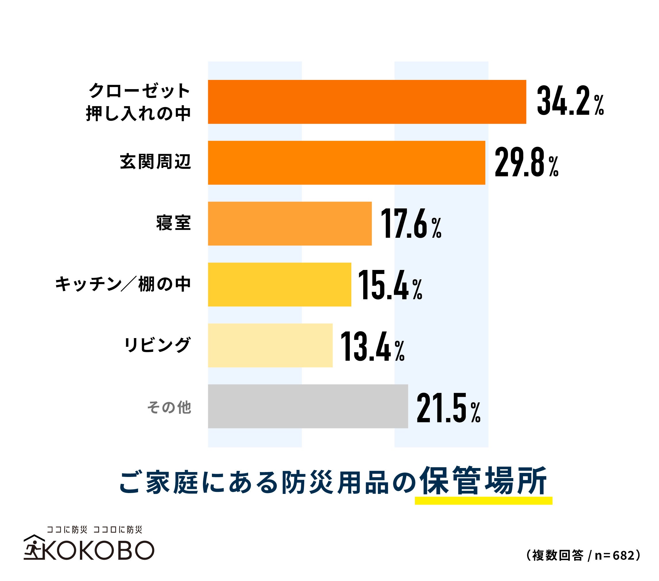 また、「ご家庭にある防災用品の保管場所」(複数回答)を尋ねたところ、「クローゼット・押し入れの中」が34.2%で最も多く、次いで「玄関周辺」が29.8%となり、 『取り出しやすい位置よりも収納しやすい場所を優先』する傾向が見られました。