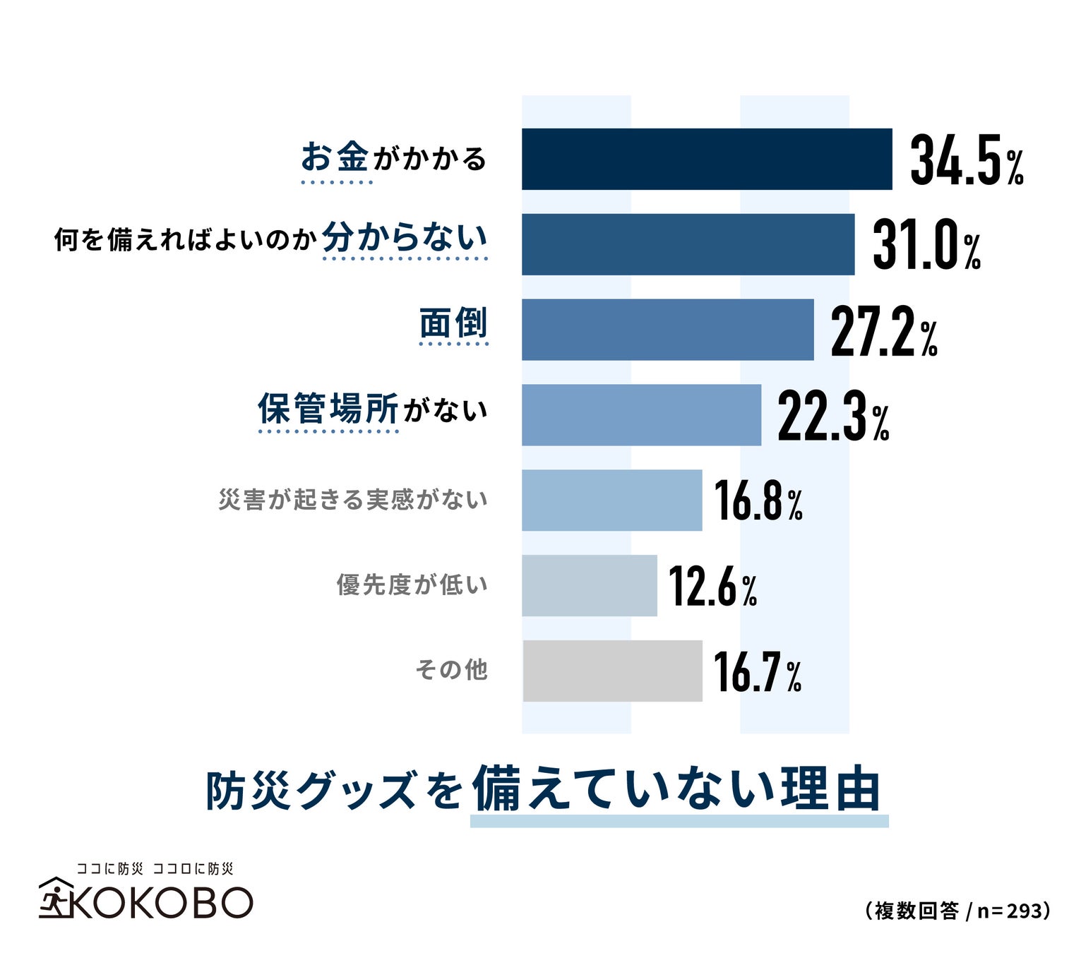 「防災グッズを備えていない理由」(複数回答)を尋ねたところ、「お金がかかる」が最多で34.5%、次いで「何を備えればよいのか分からない」が31.0%、「面倒」が27.2%、「保管場所がない」22.3%といった理由が並びました。