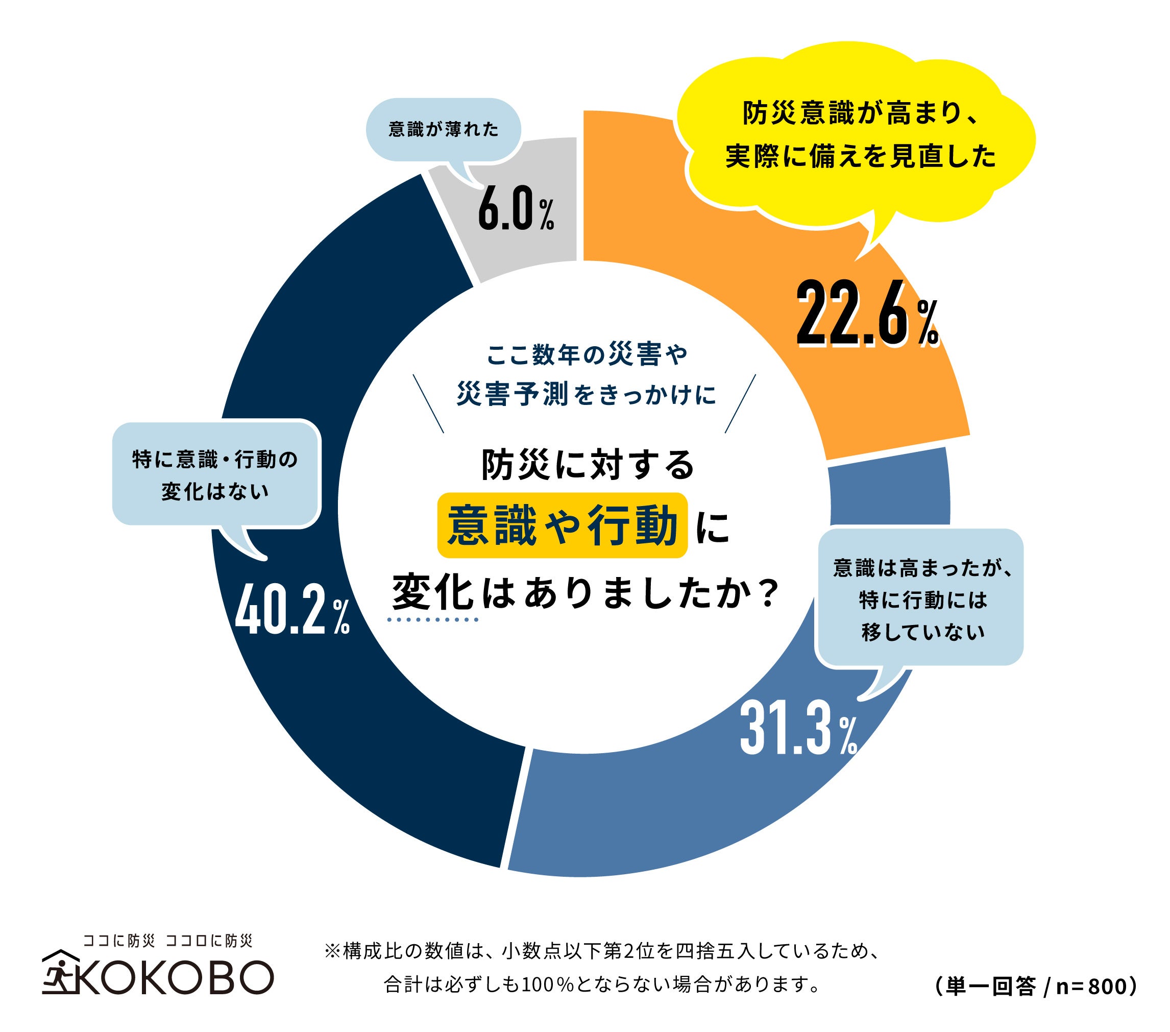 「ここ数年の災害(地震・豪雨など)や災害予測に関する情報をきっかけに、防災に対する意識や行動に変化はあったか」を尋ねたところ、防災意識が高まったと回答した人は過半数だったものの、実際に備えを見直した人は全体の約2割であることが分かりました。