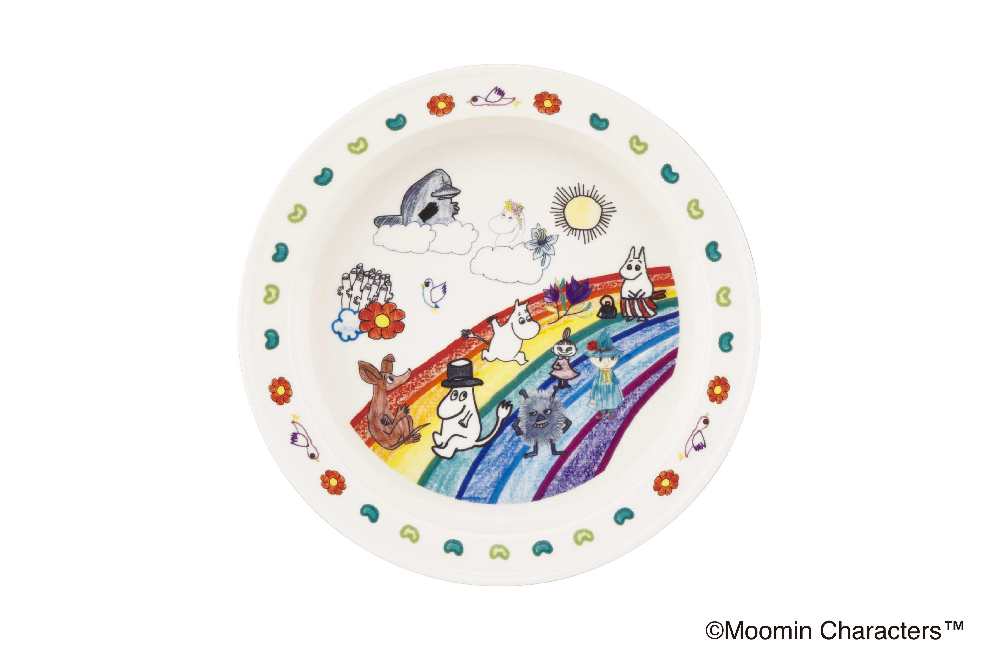 虹の上で楽しそうに過ごす「ムーミン」たちを描いたイラストを大きくあしらったプレートです。ワンプレートごはんやパスタ、デザートなど幅広く使える大きさで、子どもたちの絵がテーブルに明るい雰囲気をプラスします。