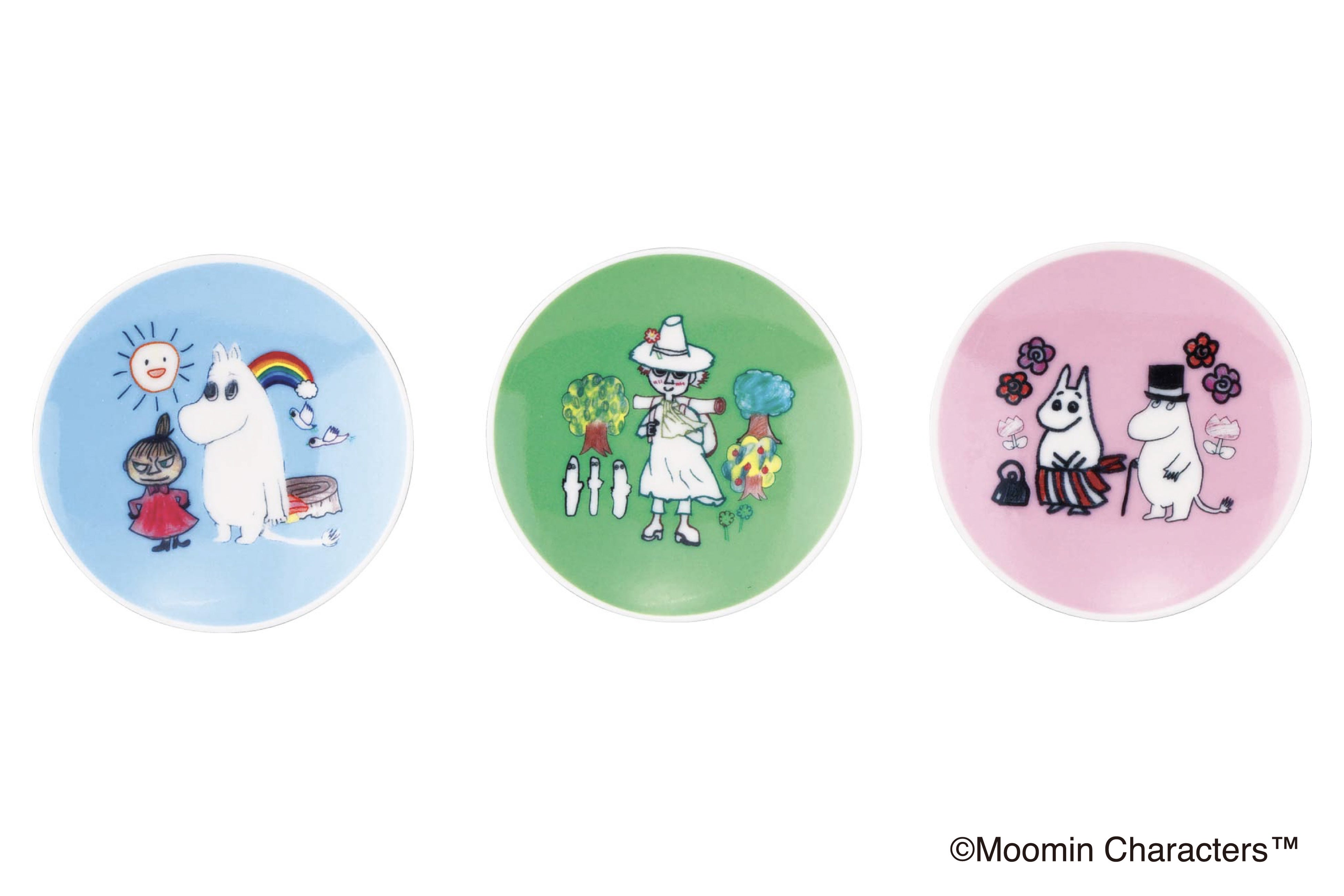 子どもたちの描いた「ムーミン」のイラストをデザインした豆皿3種類。あたたかみのある雰囲気が食卓にやさしい彩りを添えます。おやつや副菜を盛り付けるのにぴったりです。