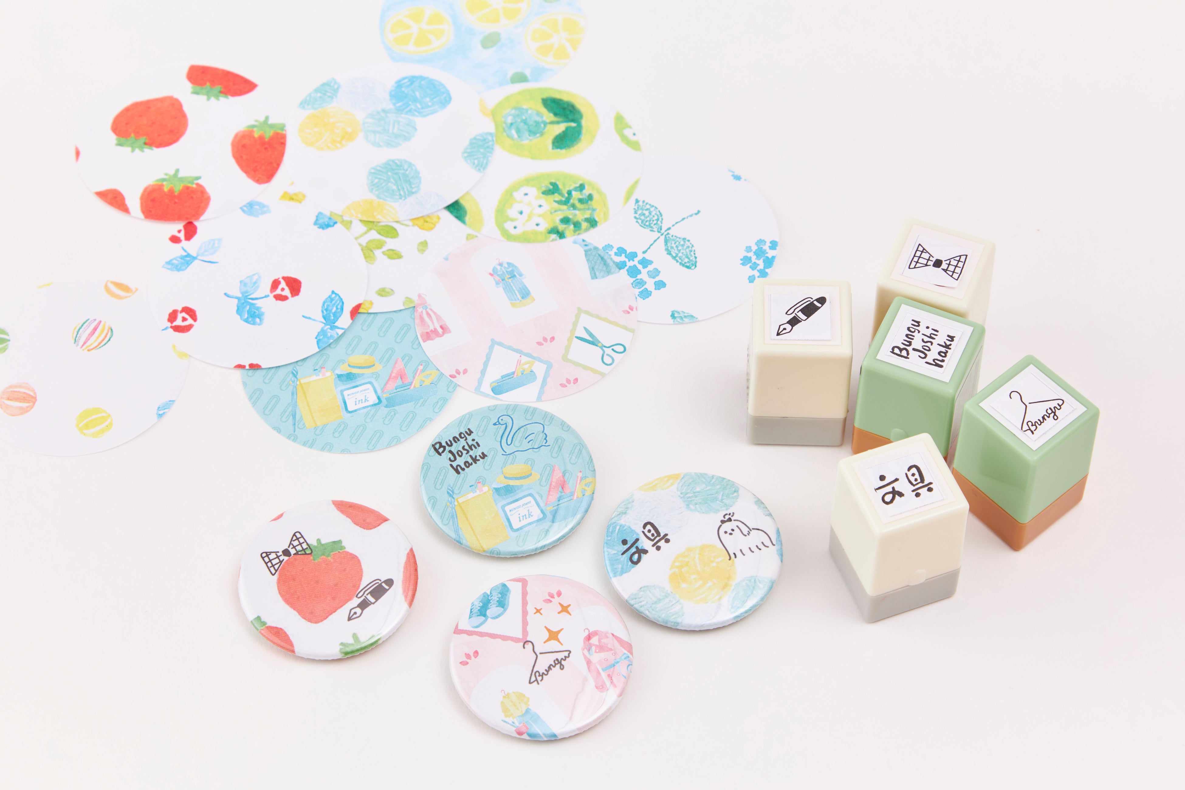 「星燈社」×「こどものかお」×「文具女子博」のスペシャルコラボが実現!開催テーマにあわせた、特別な文具コーデ企画を実施します。「星燈社」で人気の包装紙や、文具女子博メインビジュアル柄の紙に、「こどものかお」のデザインスタンプを組み合わせてオリジナル缶バッジを作ろう!どの柄にするか選ぶ時間も楽しい、文具好きにはたまらない体験企画です♪
