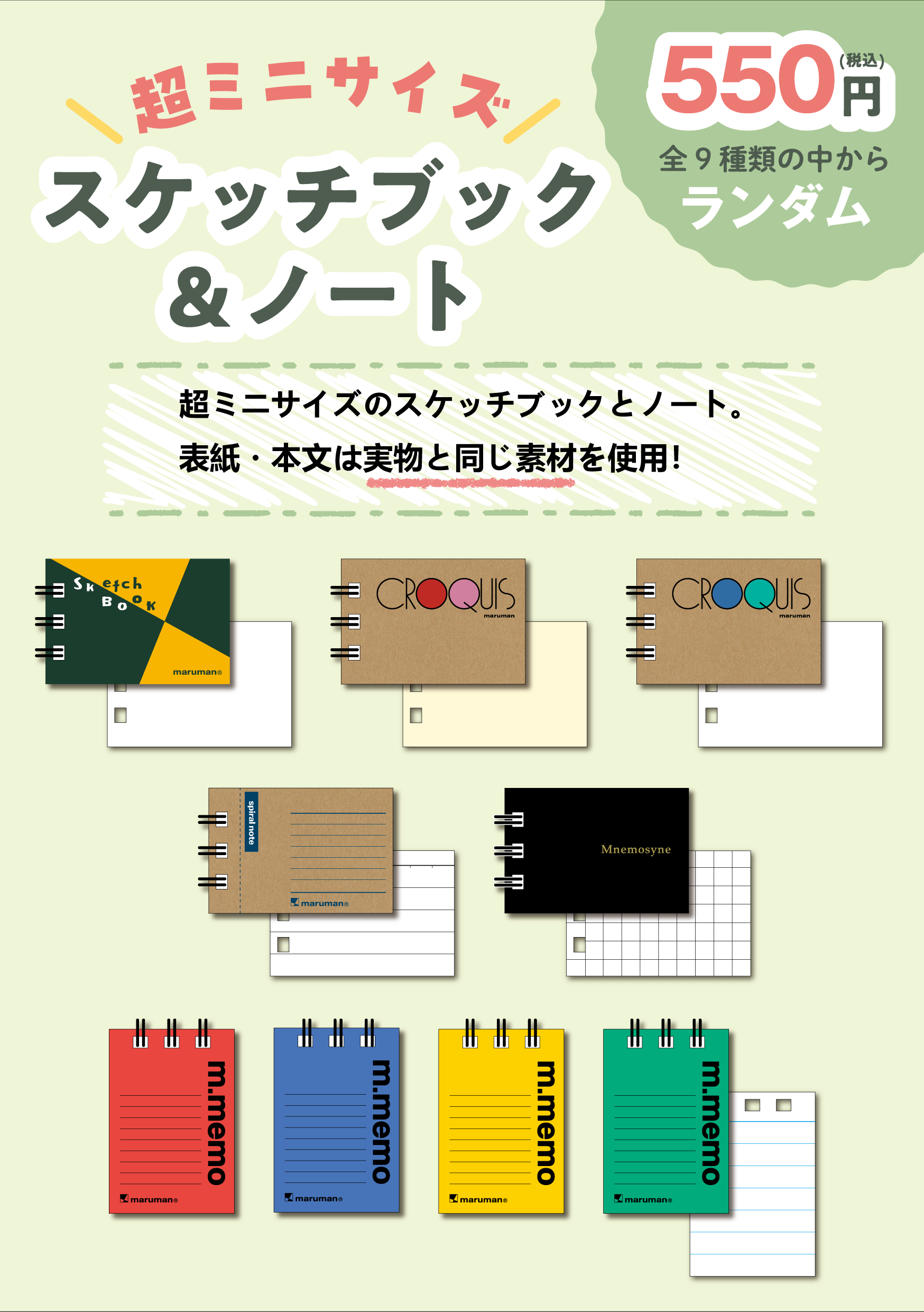 文具女子博で大人気のルーズリーフバイキング(ミニ/A5)や、マルマン商品が極小サイズになった超ミニガチャなど企画目白押しをご用意しています。また、毎年人気のよりどり福袋は、ワゴンのマルマン商品から5点選べるお得な福袋。購入者にはオリジナルA4巾着をプレゼントします。