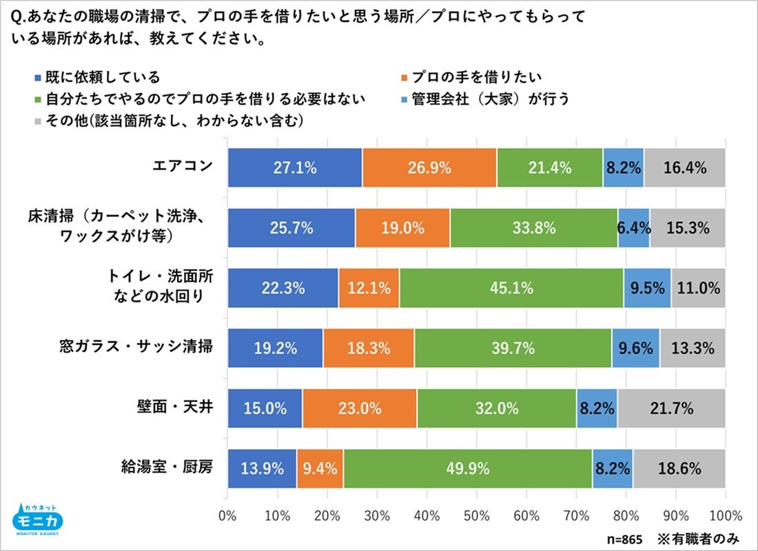 ・職場でプロへ清掃を依頼している場所は「エアコン」「床清掃」が3割弱。水回りや給湯室などは半数弱が自分たちでやると回答。