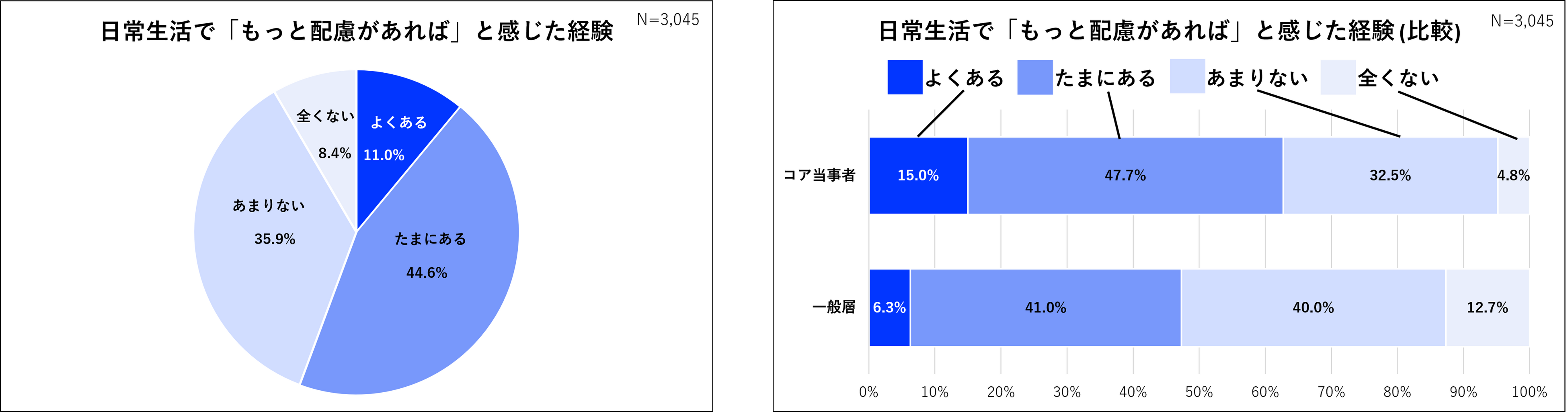 日常生活で「もっと配慮があれば使いやすくなるのに」と感じた経験有無について、「よくある」「たまにある」と回答した割合は55.6%に達しています。特に、回答者自身や家族が障がい・高齢・介護等に関わる「コア当事者」では62.7%と一般層と比較して15%以上不便を感じる割合が高く、既存製品が多様なユーザーに最適化しきれていない現状が浮き彫りとなりました。これらリードユーザーの「切実な不便」を起点に新たな価値を共創することは、単なる個別対応ではなく、すべての人にとっての「真の使いやすさ」や「普遍的な価値」を生み出すための原動力となり得ると考えられます。